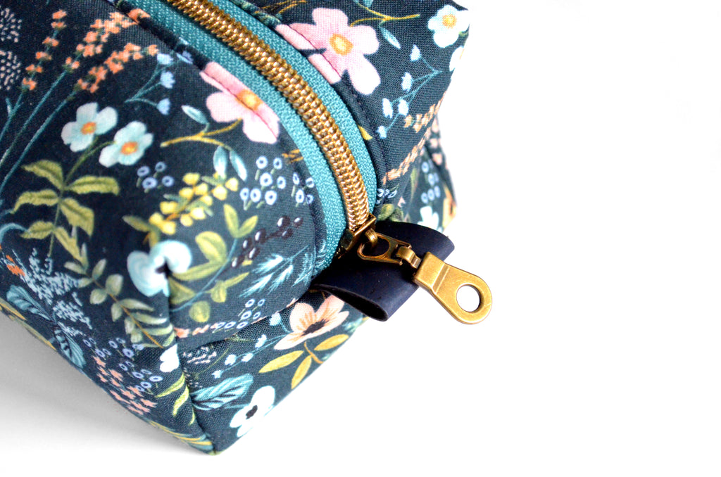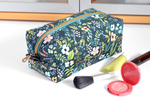 โ Thisย dark blueย boxy bag features a beautiful floral fabric designed by Rifle Paper Co!ย Itย also features a matching faux-metal zipper, and coordinating cork accent zipper tabs.ย Please note, exact fabric placement may vary from some of the photos shown.