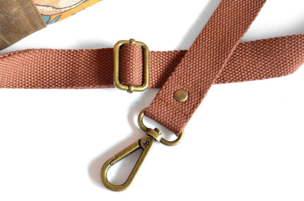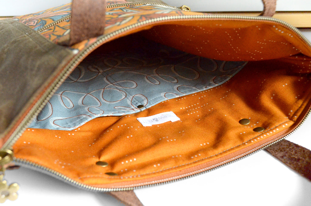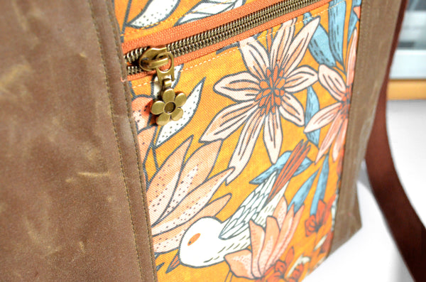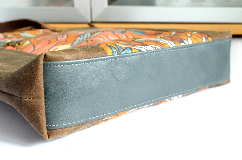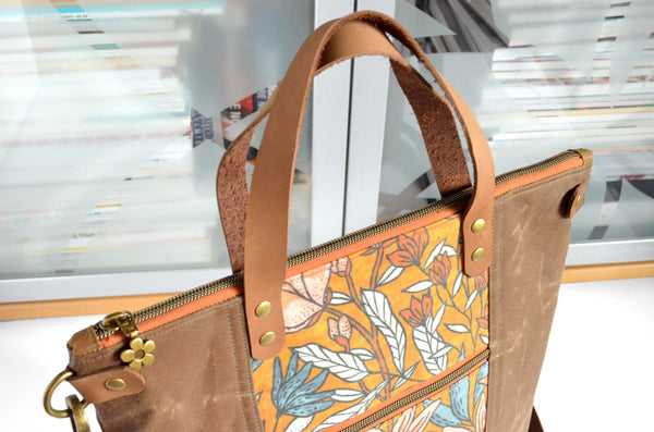 This tote bag features a caramel brown &ย silver-blueย waxed-canvasย exterior, with a beautiful floral canvasย feature panel!ย This bag includes a coordinating adjustable crossbody strap.