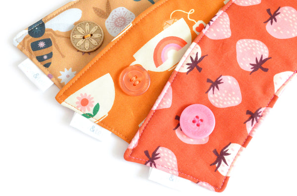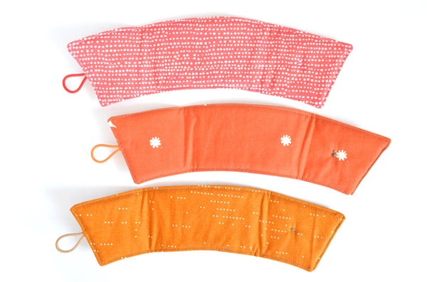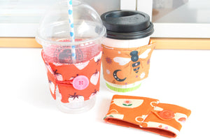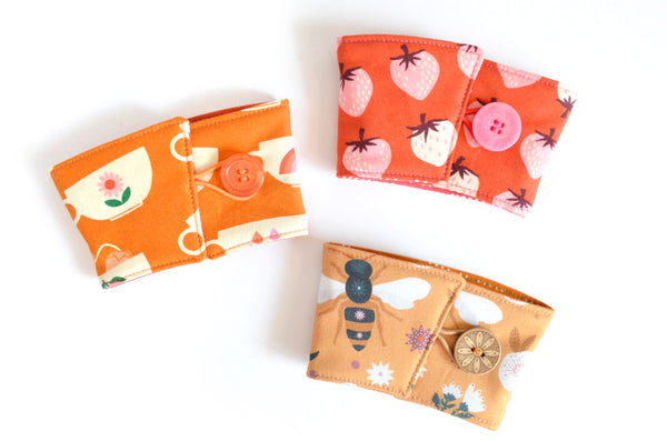โ Theseย red, orange, and yellowย coffee sleeves are made with a threeย fun prints, paired with matching buttons! Please note, exact fabric placement or button style may vary from some of the photos shown.