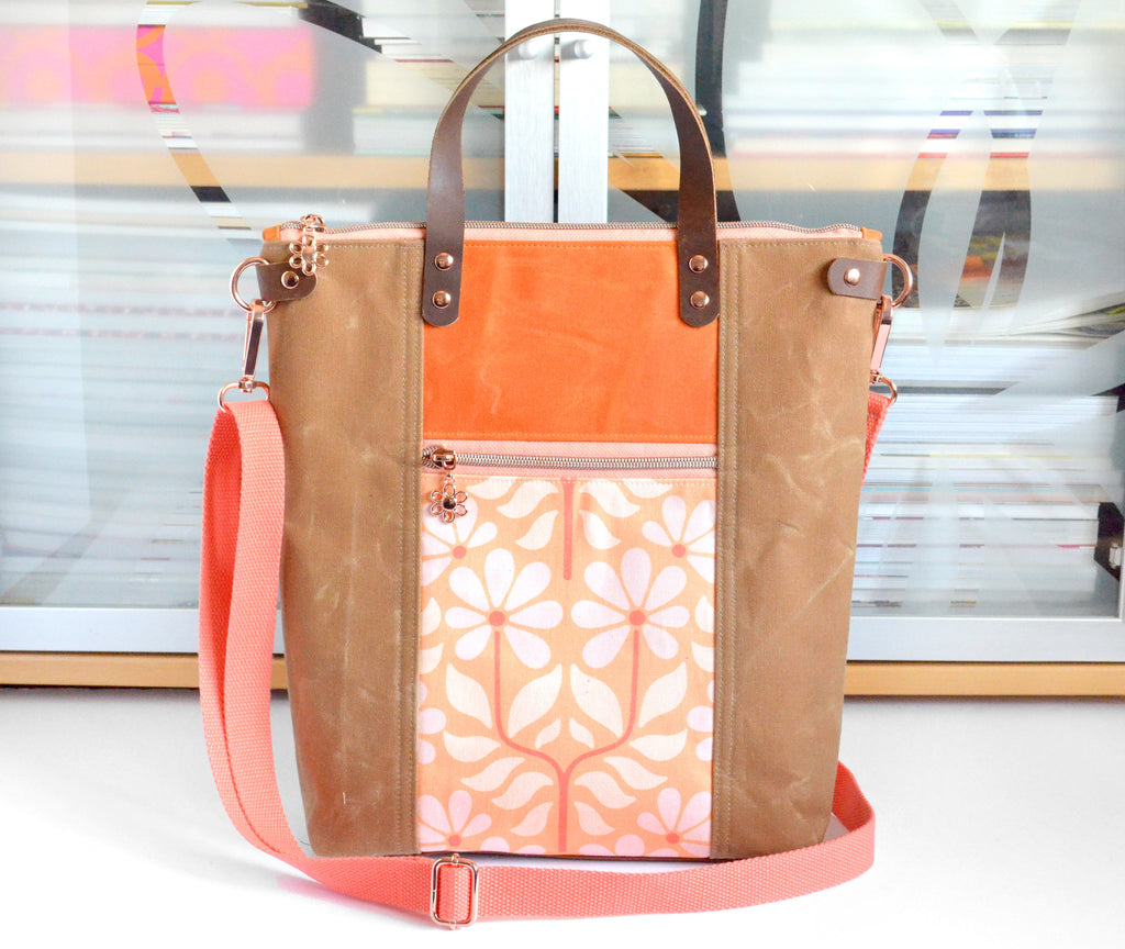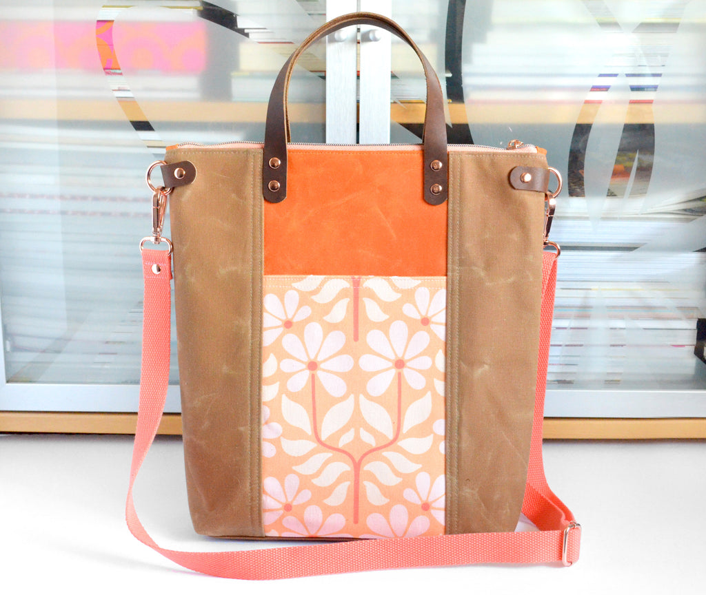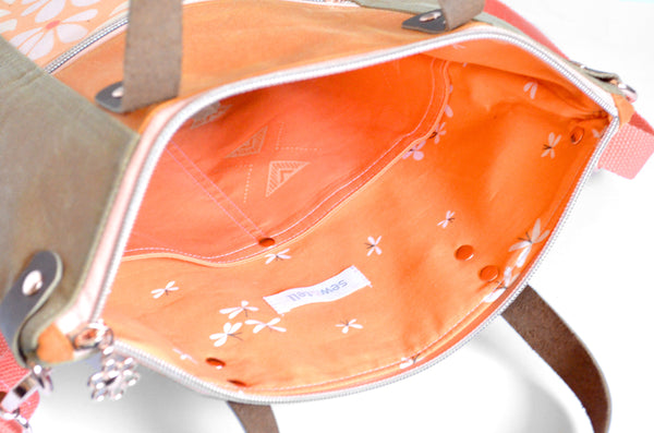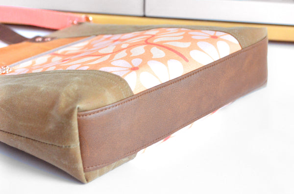This tote bag features a tan-brown & orange waxed-canvasย exterior, with a beautiful floral canvas feature panel!ย This bag includes a coordinating adjustable crossbody strap.