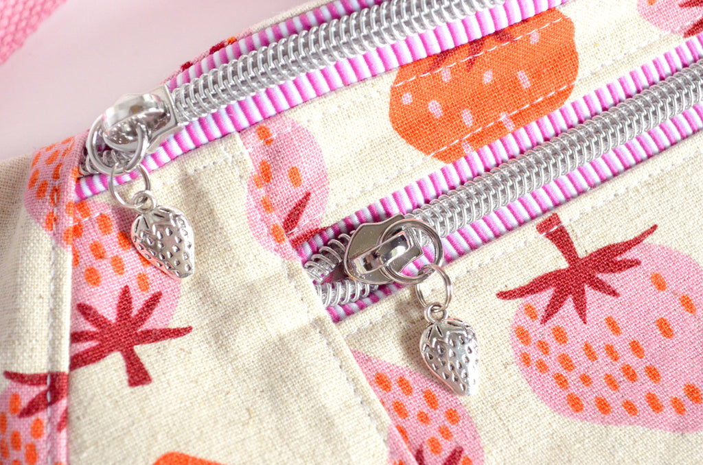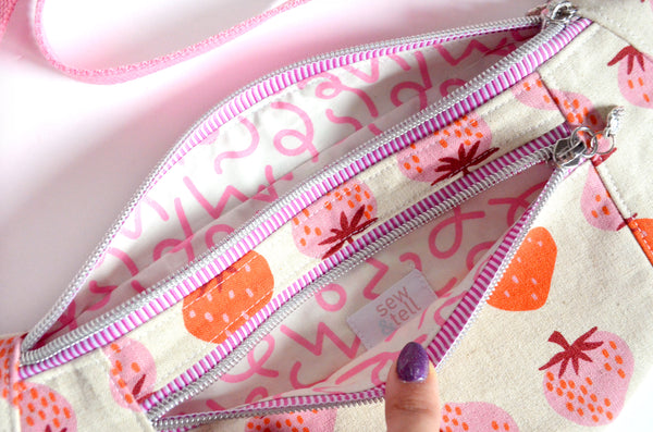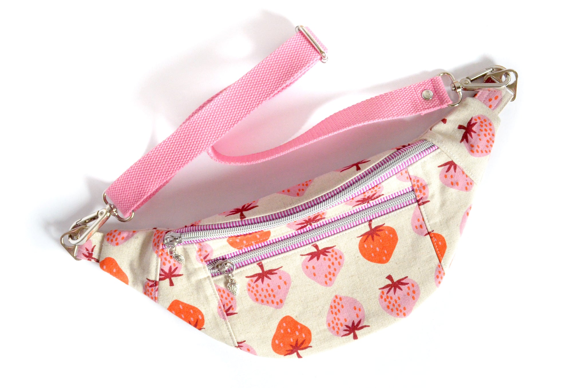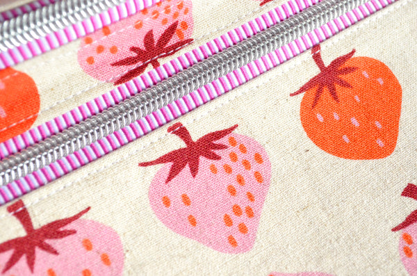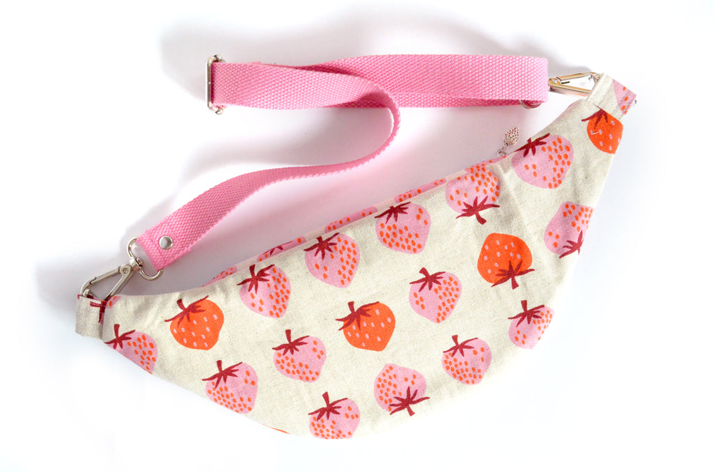 ★ This fanny pack features a beautiful pink & beige strawberry print canvas fabric exterior, with a matching interior! This bag also includes a coordinating adjustable cotton webbing strap.