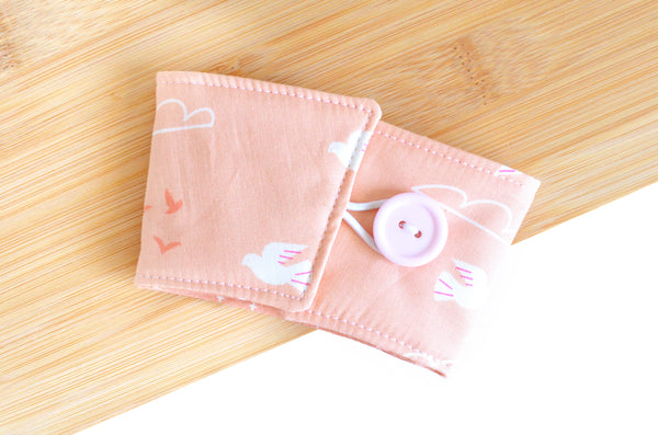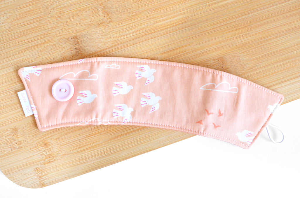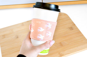 โ This pink coffee sleeve is made with a fun bird-themed fabric, and paired with a coordinating button! Please note that exact fabric placement may vary from the photos shown.