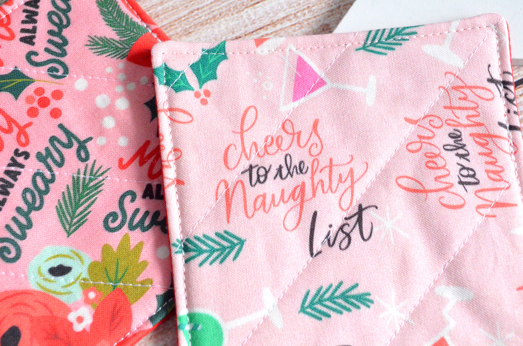 โ This set of four fabric coasters features a fun selection of "sweary" holiday fabrics! Please note, exact fabric placement may vary from some of the photos shown.