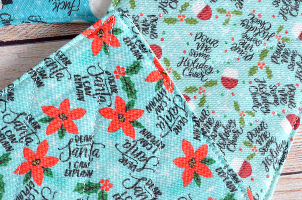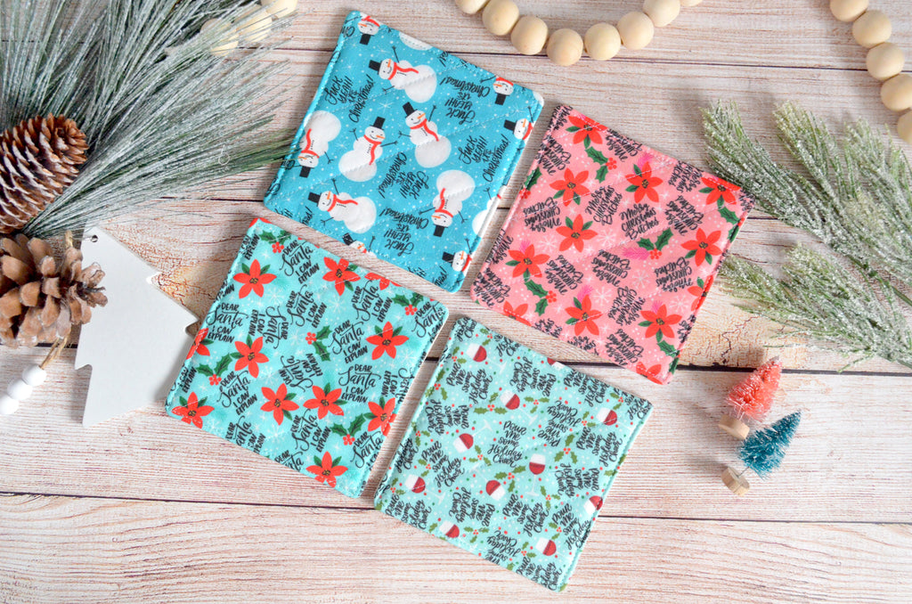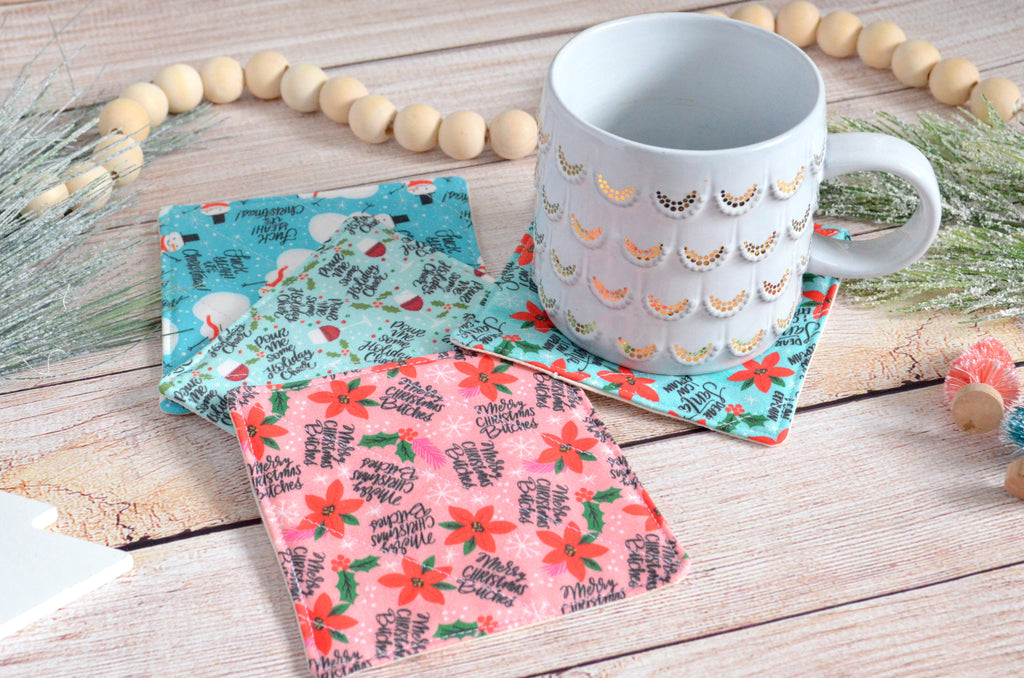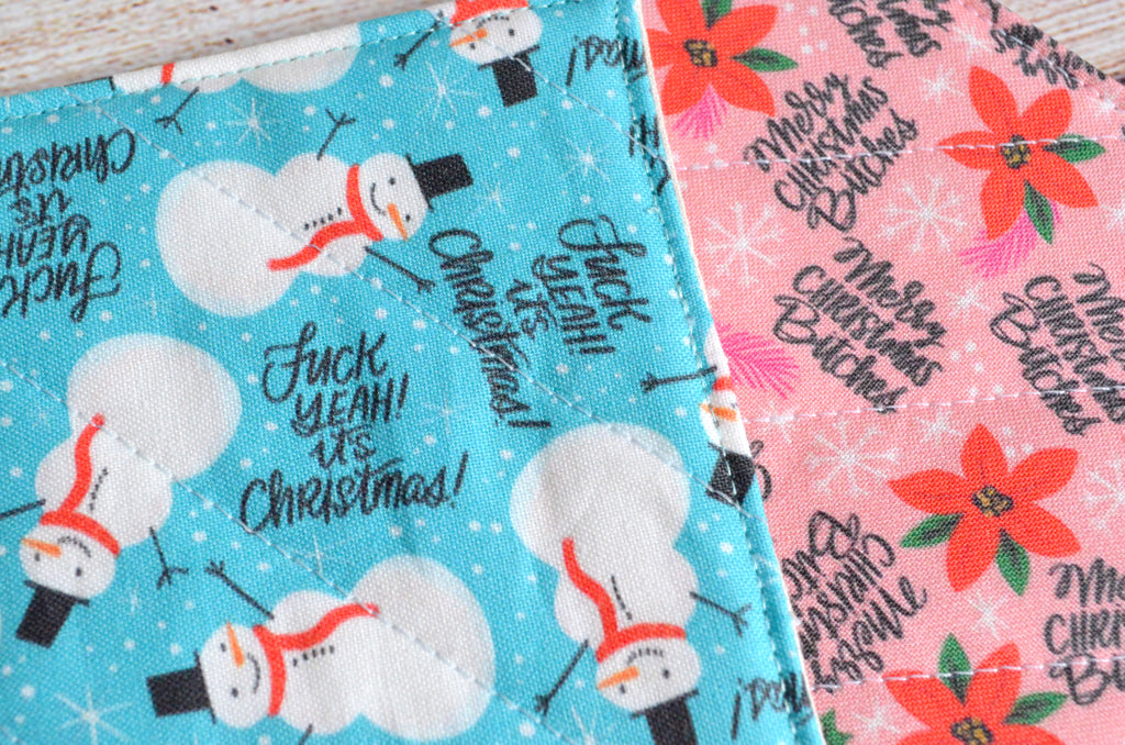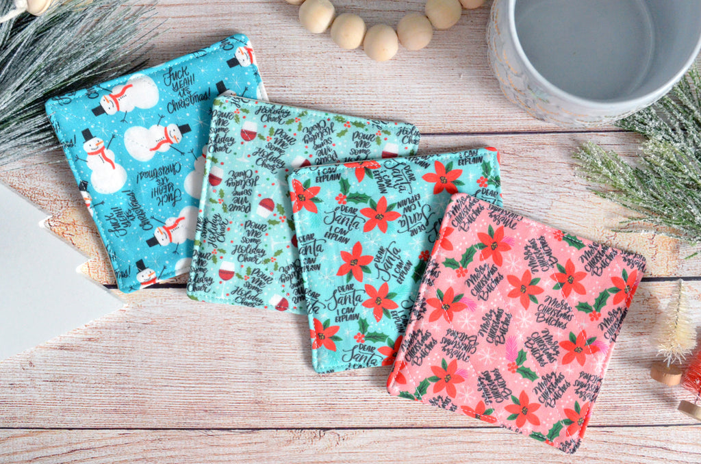 โ This set of four fabric coasters features a fun selection of "sweary" holiday fabrics! Please note, exact fabric placement may vary from some of the photos shown.