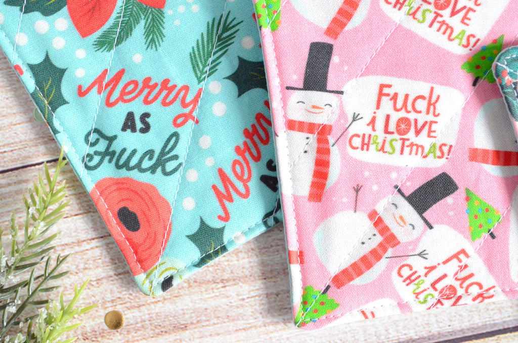 โ This set of four fabric coasters features a fun selection of "sweary" holiday fabrics! Please note, exact fabric placement may vary from some of the photos shown.