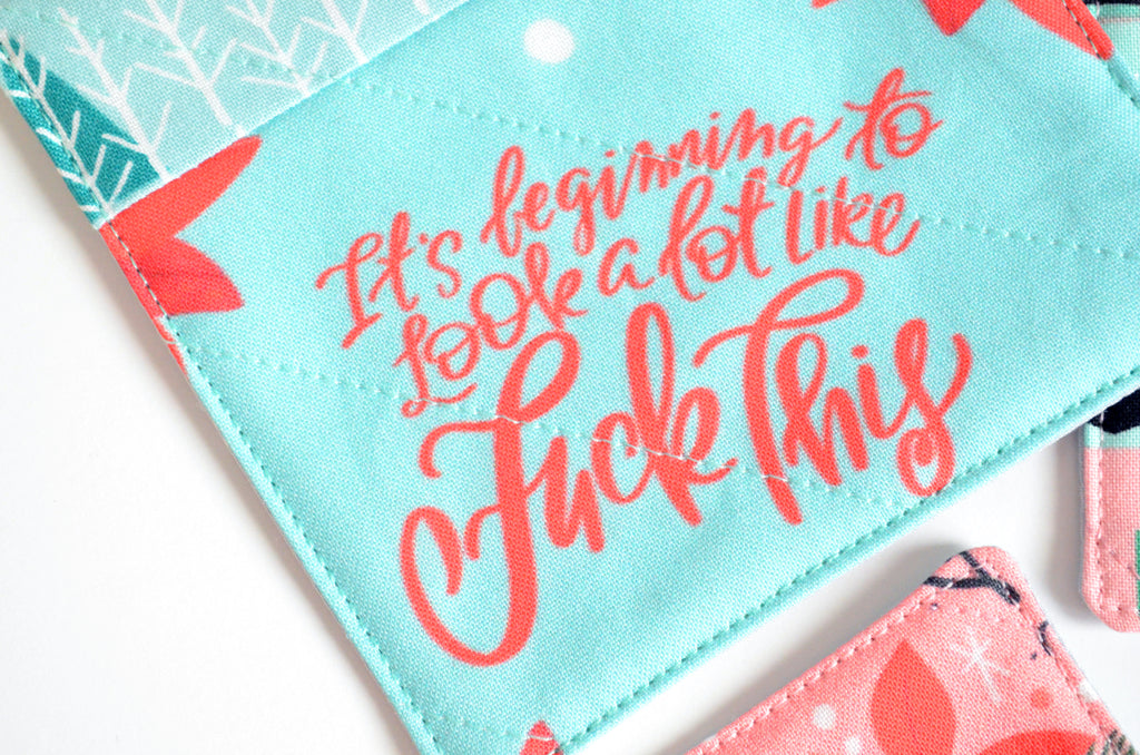 โ This set of four fabric coasters features a very fun selectionย of "sweary" sayings, designed by Canadian artist and illustrator Cynthia Frenette! These are perfect for adding a touch of whimsy and humour to your holiday decor!ย