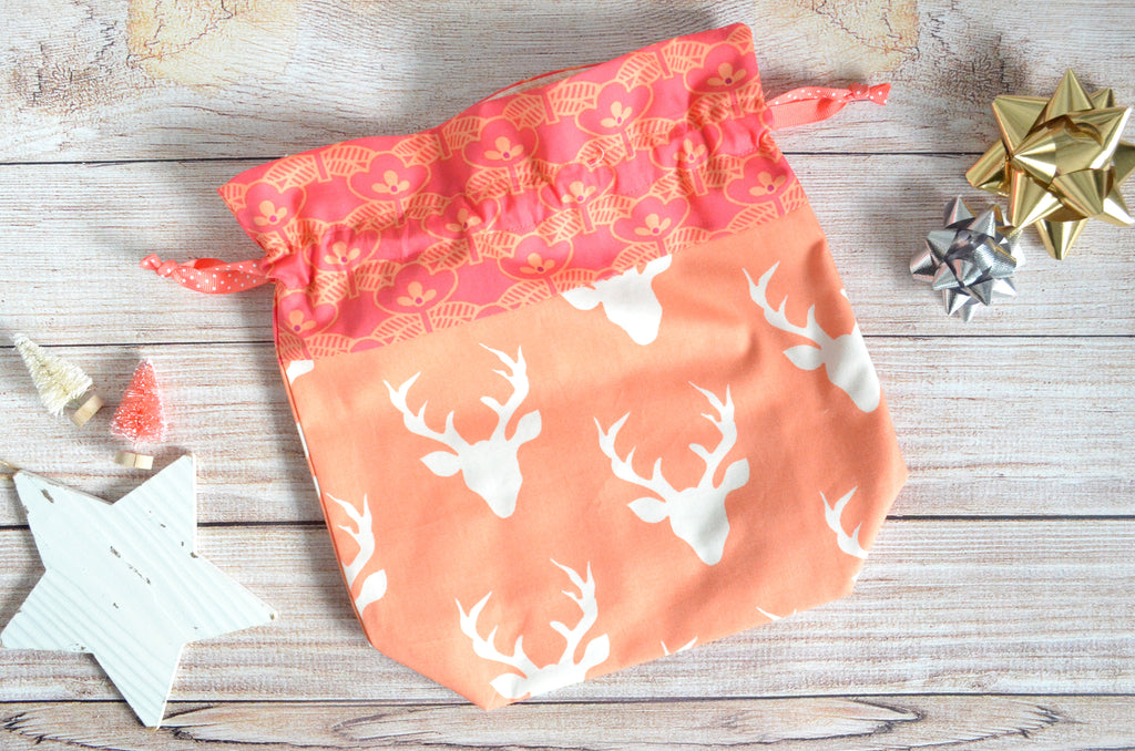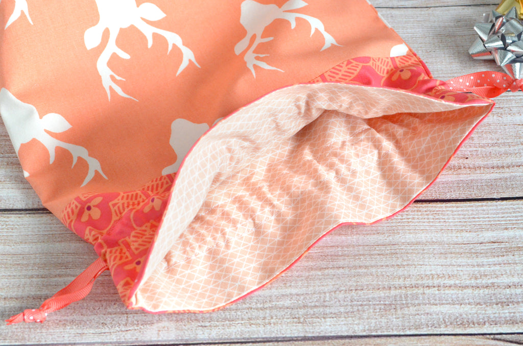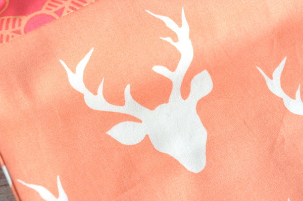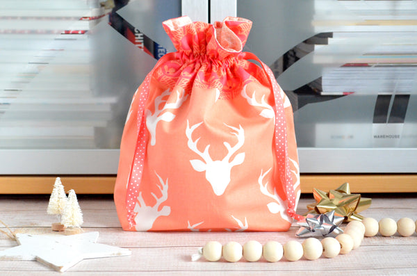 โ Theseย coral-pink drawstring bags are made fromย a beautiful quilting cotton, featuring an adorableย deer print! Please note, exact fabric placement may vary.