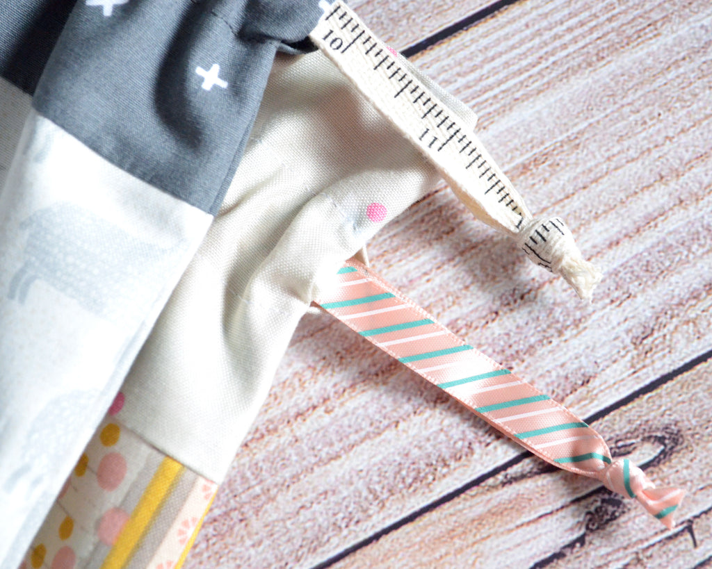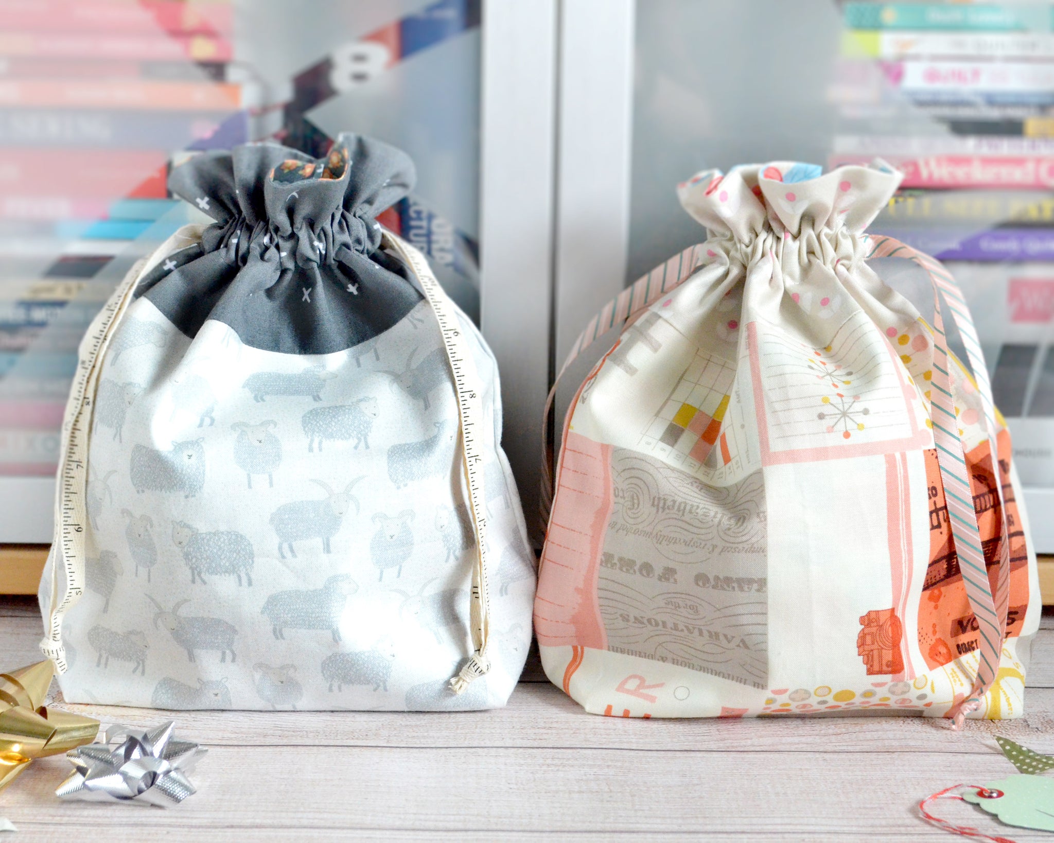 โ Theseย pink and white drawstring bags are made from a variety of beautiful quilting cottons, featuring aย fun label printย &ย woolly sheep!ย