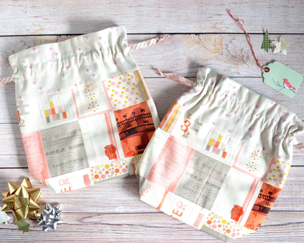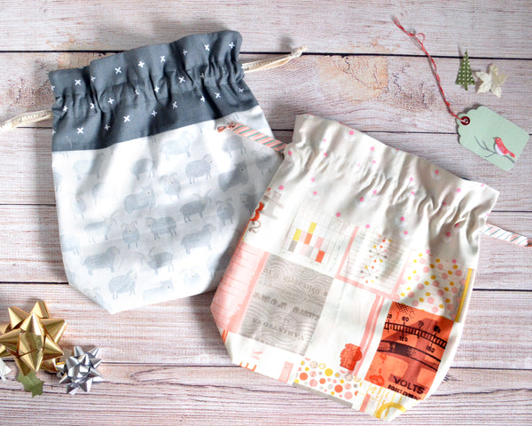 These adorable fabric gift bags are made from a variety of fun and festive cotton prints perfect for the holidays! Not only do these bags make gift-wrapping fast and easy, theyโre also a great eco-friendly alternative to traditional paper wrapping. These bags can be kept to re-use during the holidays year after year, or immediately afterwards for everyday storage. The simple-to-use pull ties make them perfect for storing childrenโs toys and games, while also making great knitting or sewing bags, keeping your supplies for each project organized.ย These bags are sure to make your friends and family smile when they receive their gift wrapped up in one these!