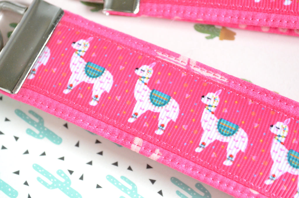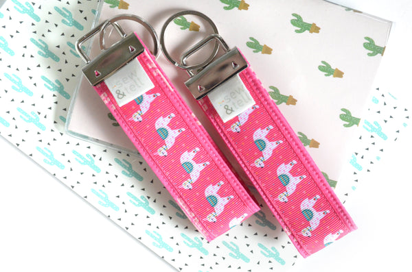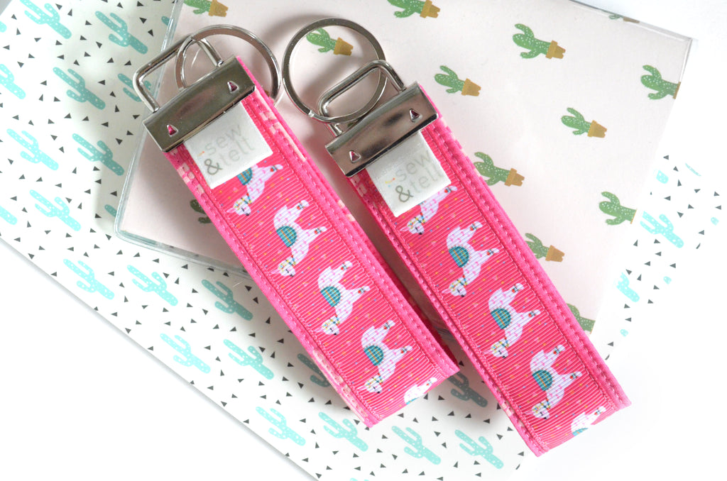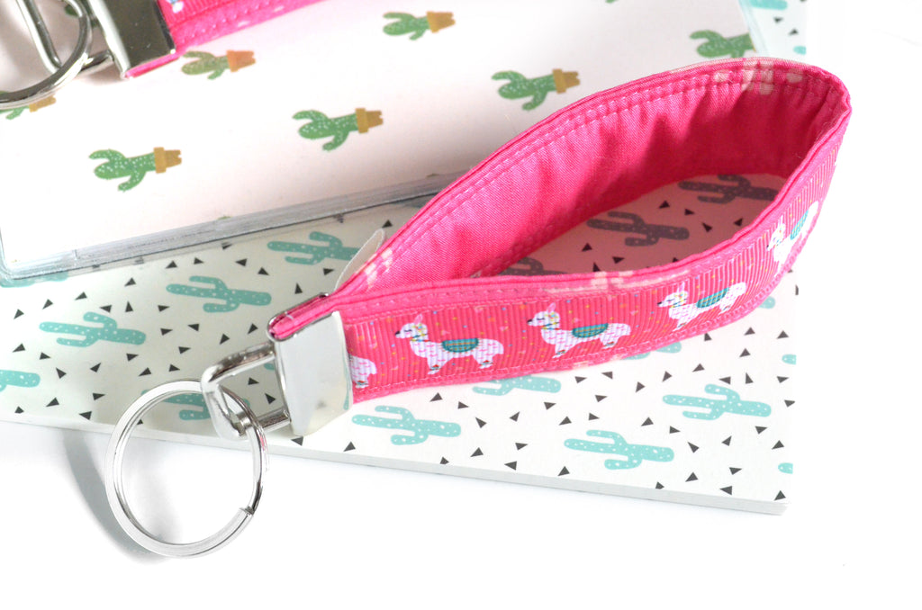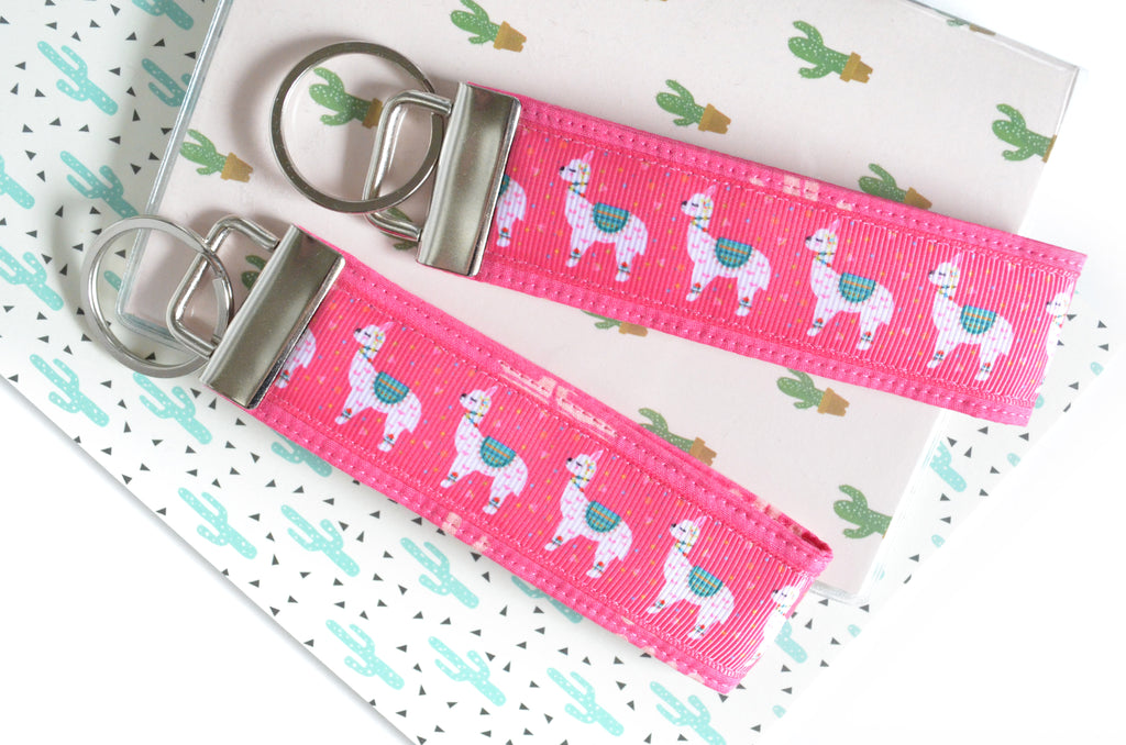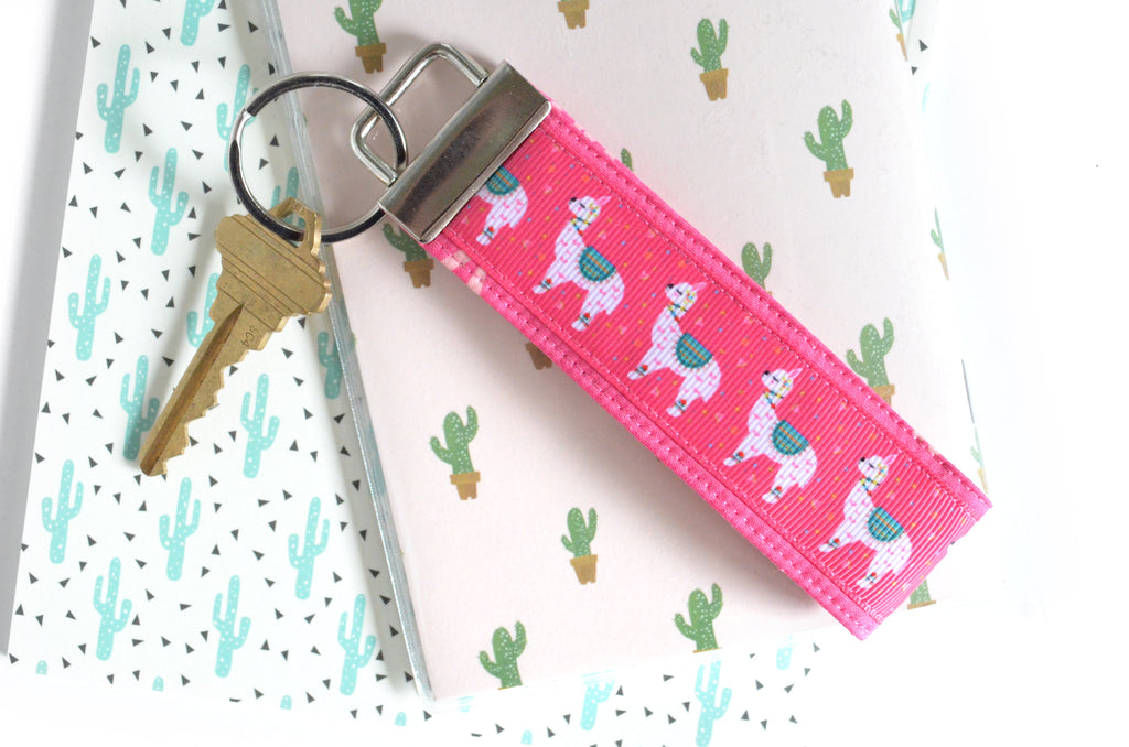 โ This bright pink key fob features a beautiful mix of cotton fabric and llama-print ribbon! Please note that exact pattern-placement of the ribbon may vary slightly from the photos.