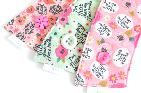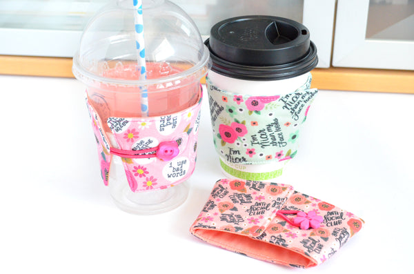 โ Theseย pink & mint blueย coffee sleeves are made with a threeย fun "sweary" prints, paired with matching buttons! Please note, exact fabric placement or button style may vary from some of the photos shown.
