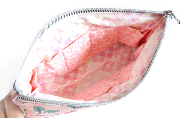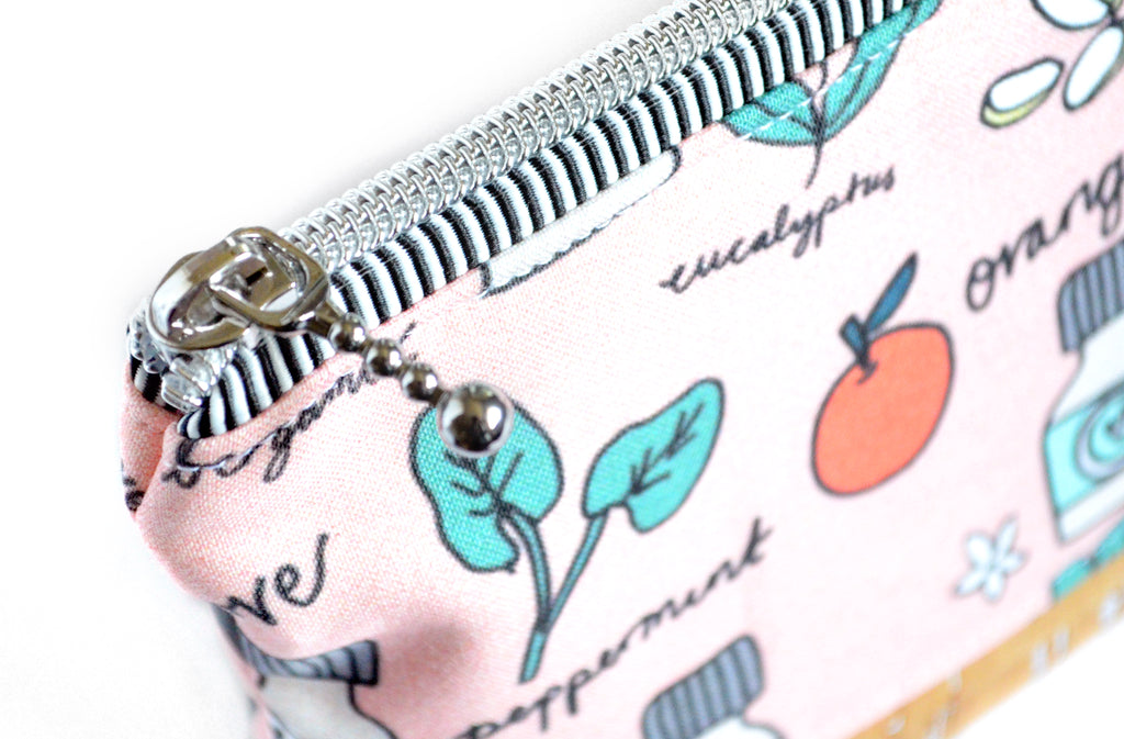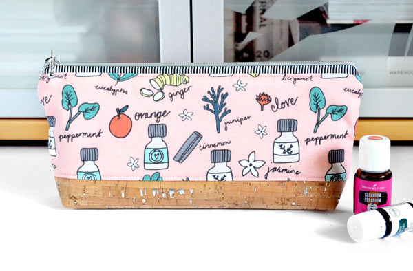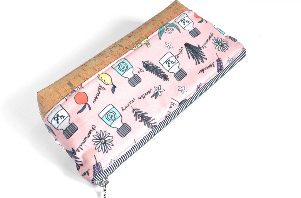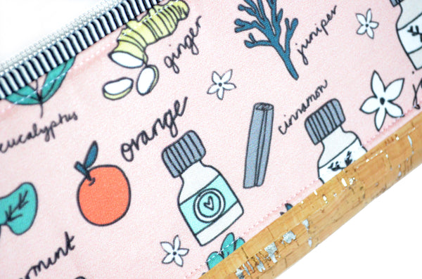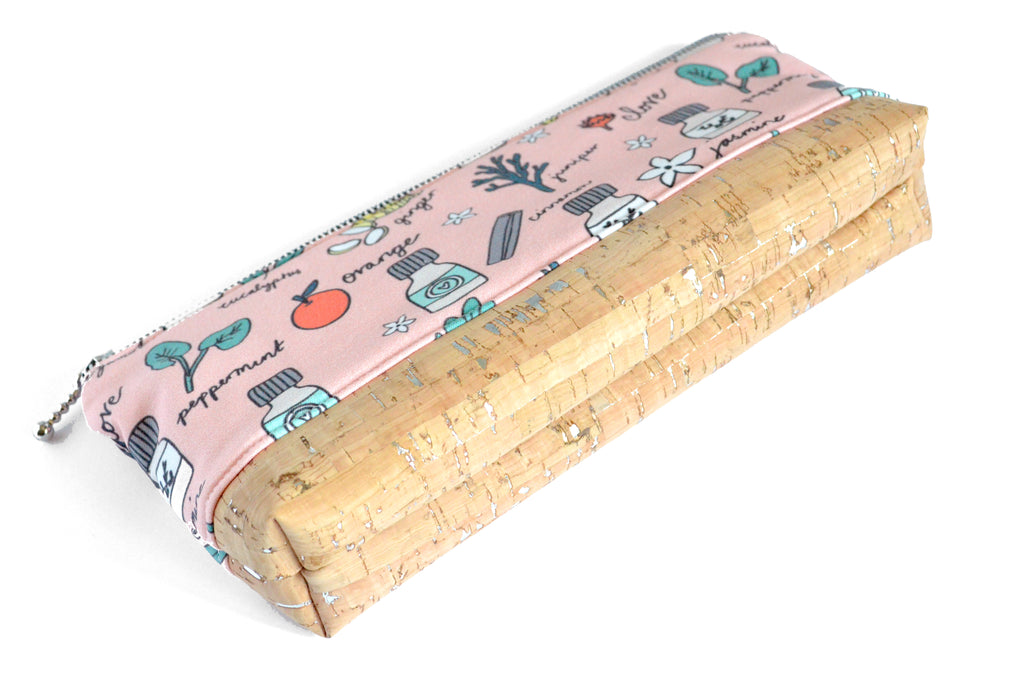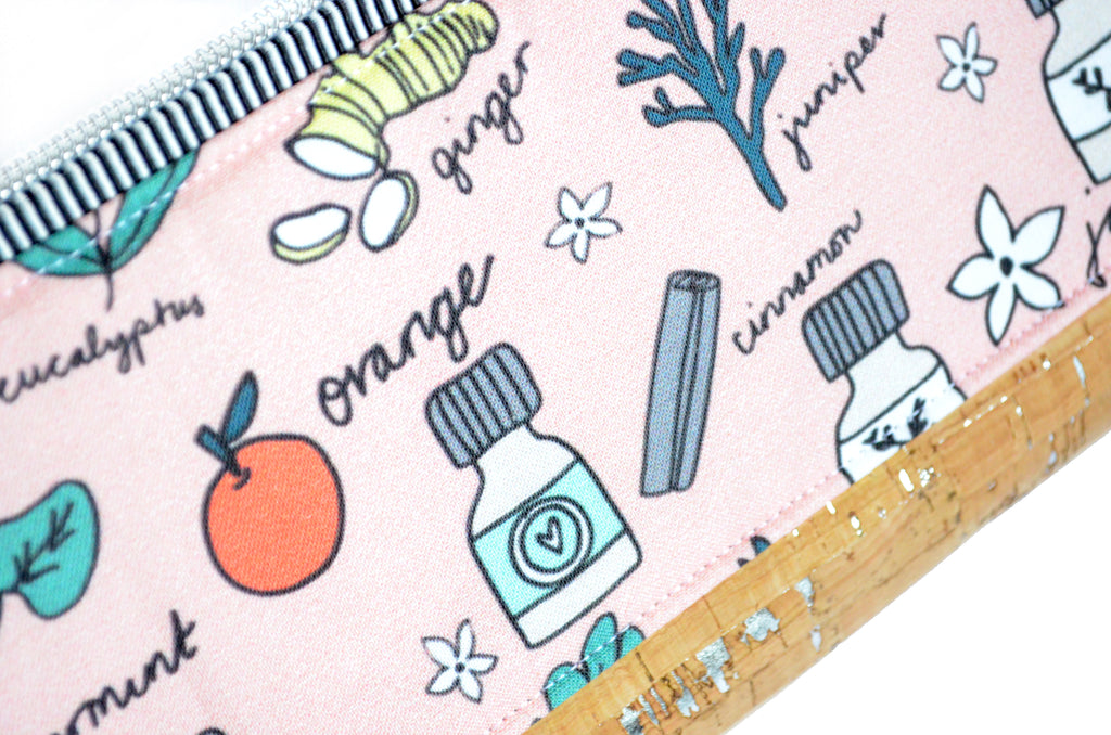 ★ This pink essential oil pouch features a fun essential oil themed fabric, accented by a metallic-fleck cork leather bottom