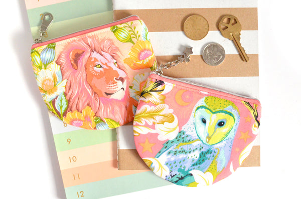 โ ย These pink coin purses feature two beautiful owl & lion print fabrics, with a coordinating print on the backside!ย