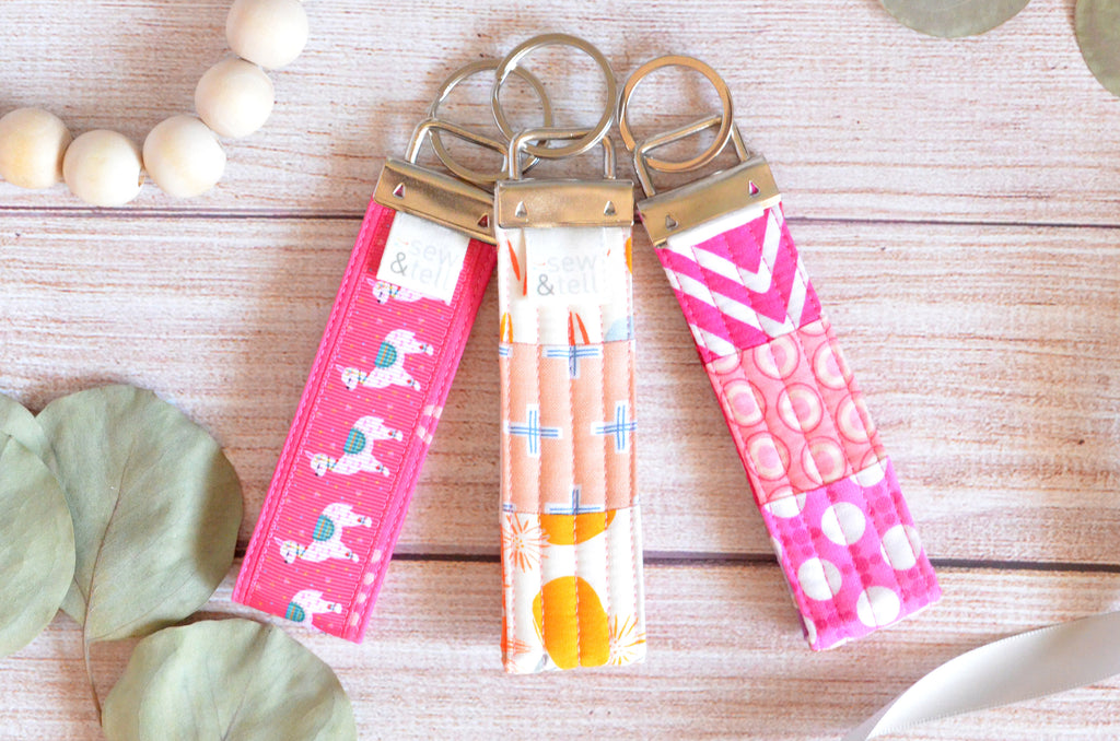โ ย These key fobs feature a beautiful mix of cotton fabrics in a variety of prints and colours, quilted with beautiful straight-lines in a coordinating thread