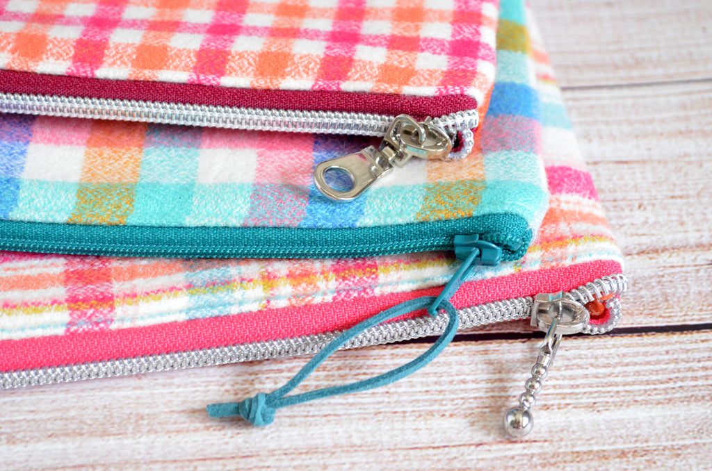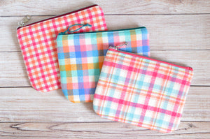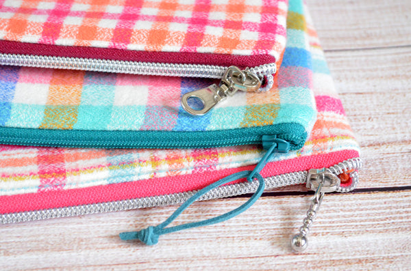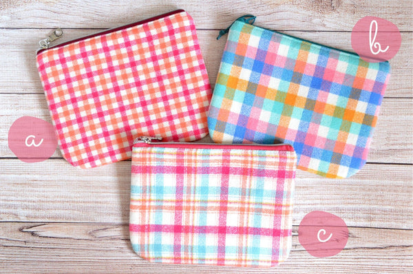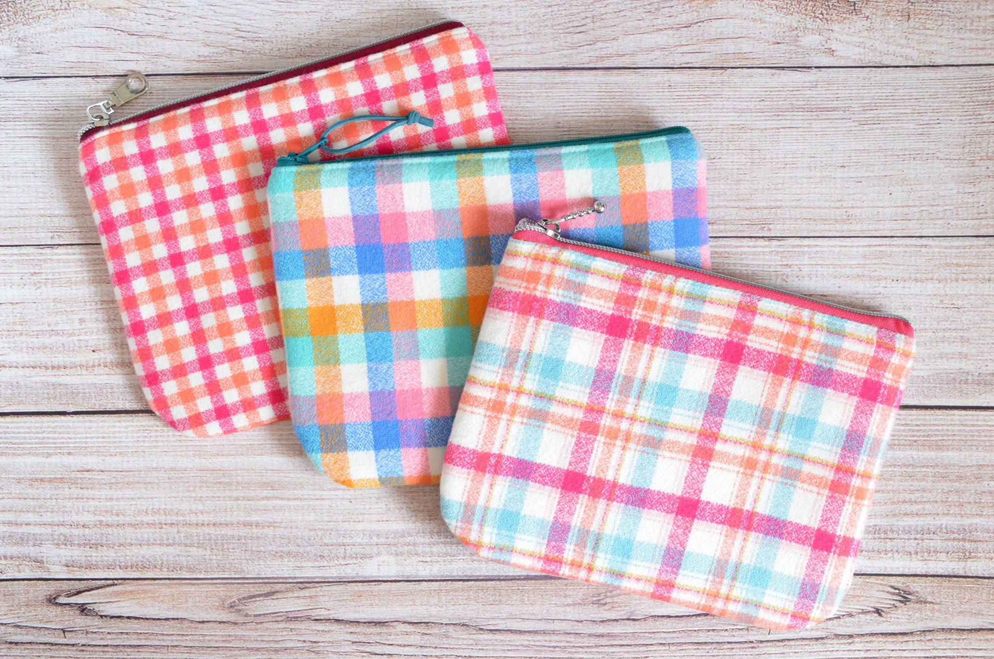 These Fall collection pouches feature a variety of beautiful plaid flannel fabrics and woven cotton prints! On the back-side you'll find a lovely matching linen, canvas, or embroidered woven fabric. Made with an inner-layer of cotton quilt batting, these pouches are super soft and plush!
