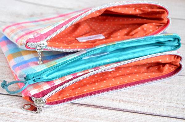 These small all-purpose pouches are perfect for keeping essential items organized in your purse, holding makeup or toiletries, pens and pencils, or as a charger cord pouch!