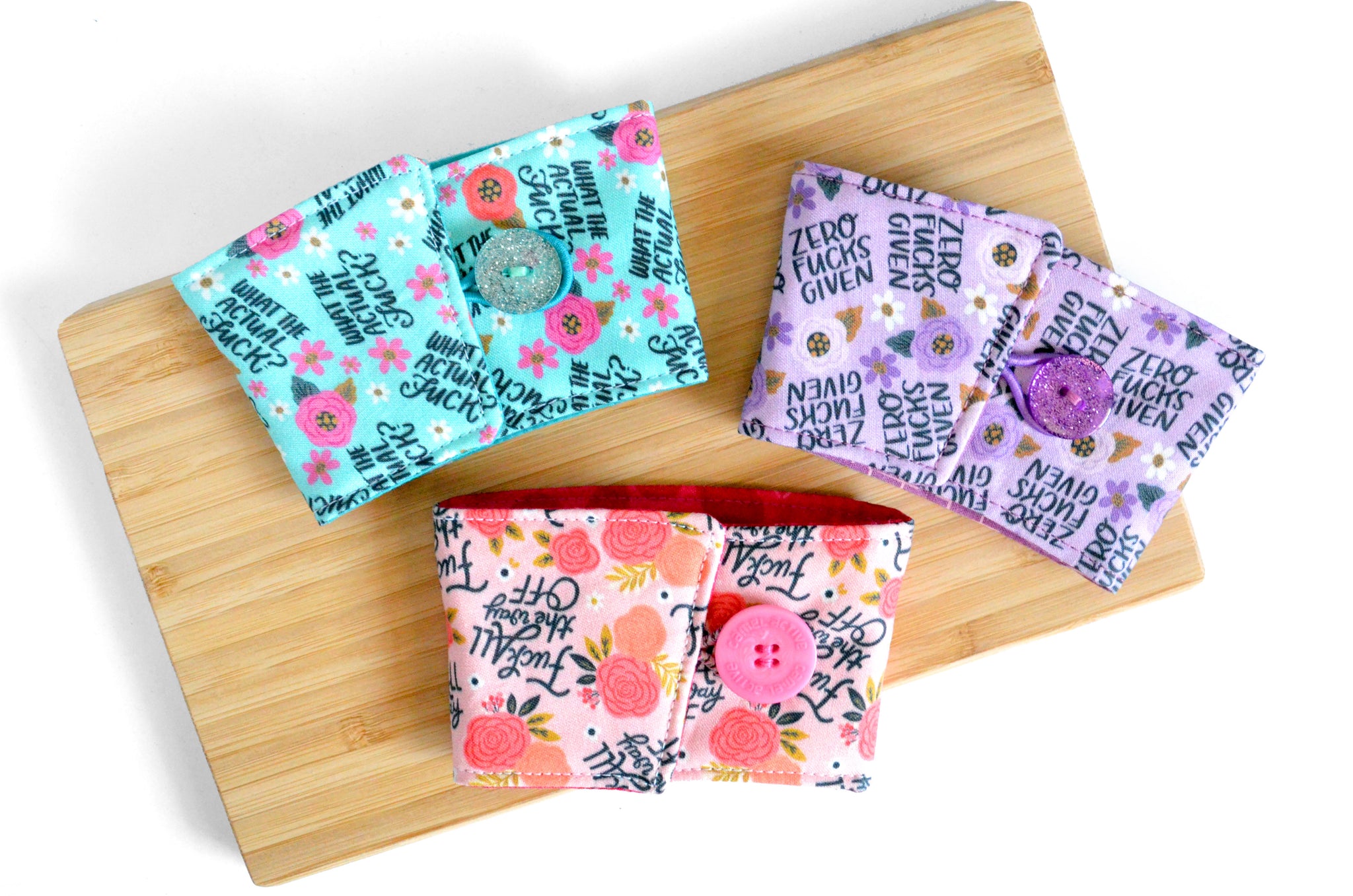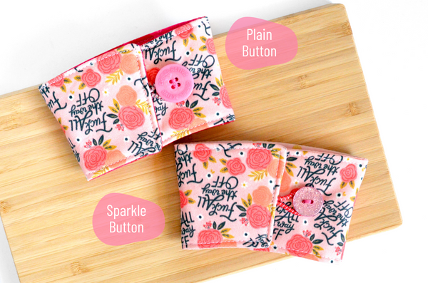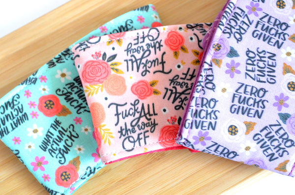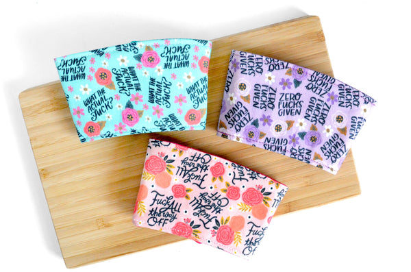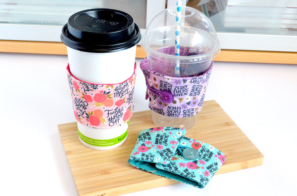 โ These pink, purple, and blue coffee sleeves are made with three fun "sweary" prints, paired with matching buttons! Please note, exact fabric placement or button style may vary from some of the photos shown.