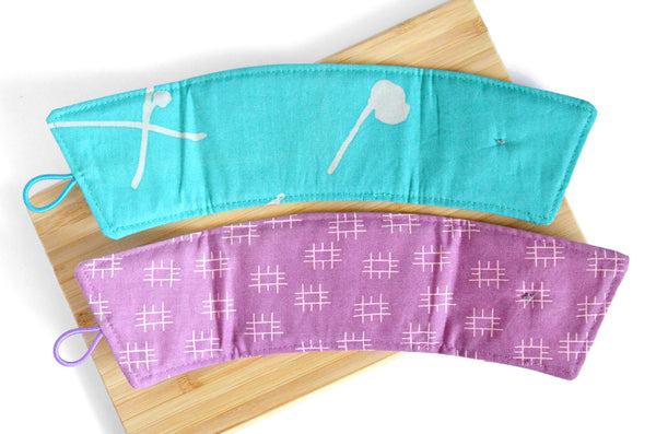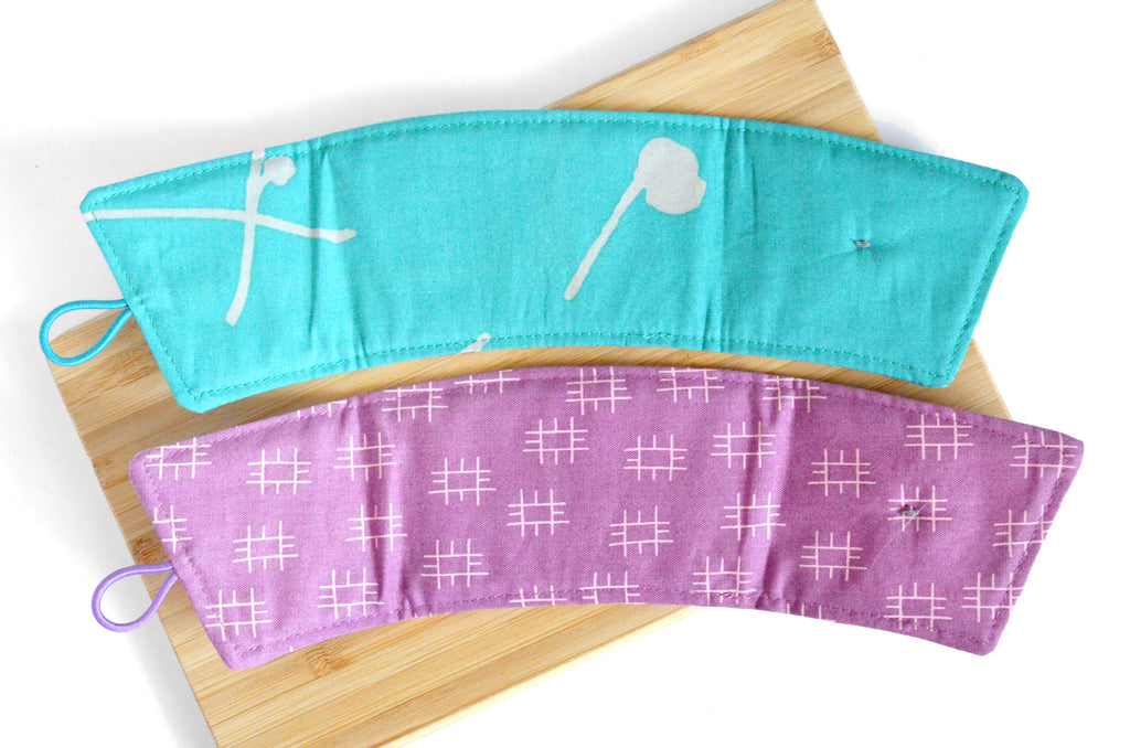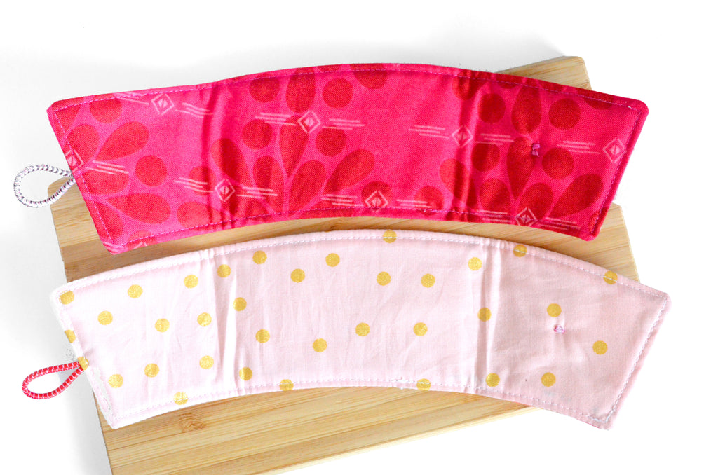 Calling all coffee and tea lovers! These reusable coffee sleeves are an eco-friendly alternative to disposable cardboard sleeves which often end up in the trash. Available in a wide range of bright and beautiful fabrics and made with an inner layer of cotton batting, your hands will be kept safe from hot heat or the cold, wet condensation of iced beverages! The elastic and button closure makes these sleeves fully adjustable to fit a wide range of disposable cups or reusable tumblers and thermoses. Keep one in your bag, one at the office, and in the car for your coffee runs! Paired with a gift card to your local coffee shop, these make the perfect gift for the coffee or tea lover in your life!