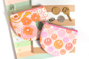 โ ย These pink coin purses feature two fun floral & smiley face print fabrics, with a coordinating print on the inside & backside!ย