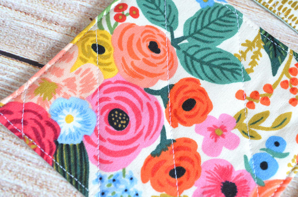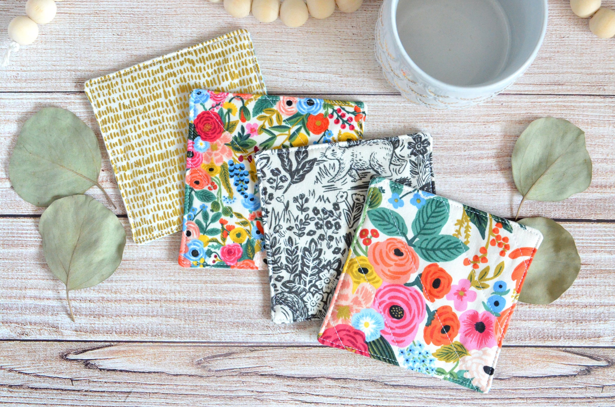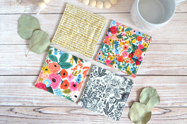 โ This set of four fabric coasters features a beautiful selection of Rifle Paper Co floral printย fabrics! Please note, exact fabric placement may vary from some of the photos shown.ย