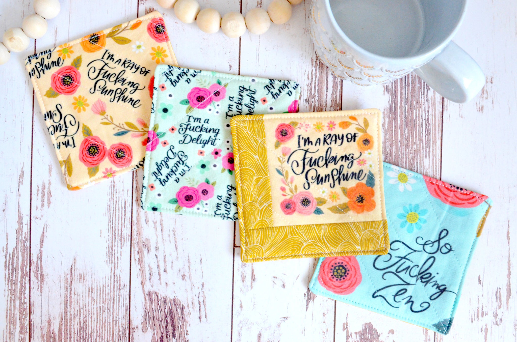 โ This set of four fabric coasters features a fun selection of fabrics withย "sweary" sayings designed by Canadian artist and illustrator Cynthia Frenette! Please note, exact fabric placement may vary from some of the photos shown.