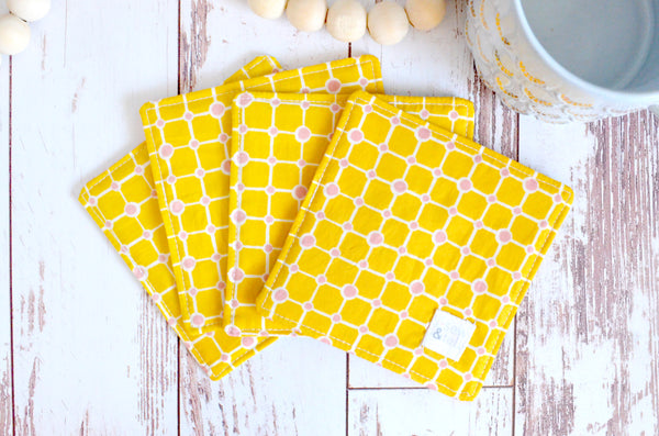 Our quilted fabric coaster sets are sure to bring a pop of colour to your coffee table or dining room, while also providing you with practicality and versatility! Made with a layer of cotton quilt-batting inside, these coasters are great at soaking up unwanted condensation from your drink, and wonโt stick to your glass when you pick it up! Available in a wide-range of fun prints and colours, these coasters also make for the perfect unique housewarming or hostess gift!