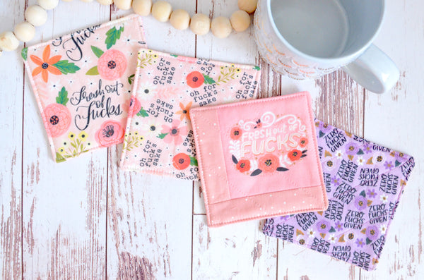 โ This set of four fabric coasters features a fun selection of fabrics withย "sweary" sayings designed by Canadian artist and illustrator Cynthia Frenette! Please note, exact fabric placement may vary from some of the photos shown.