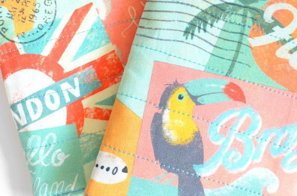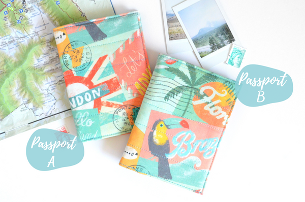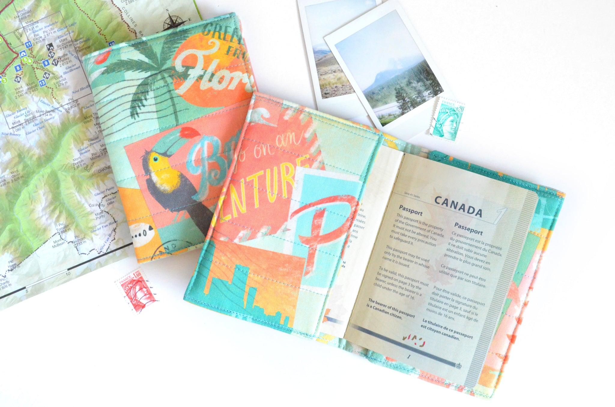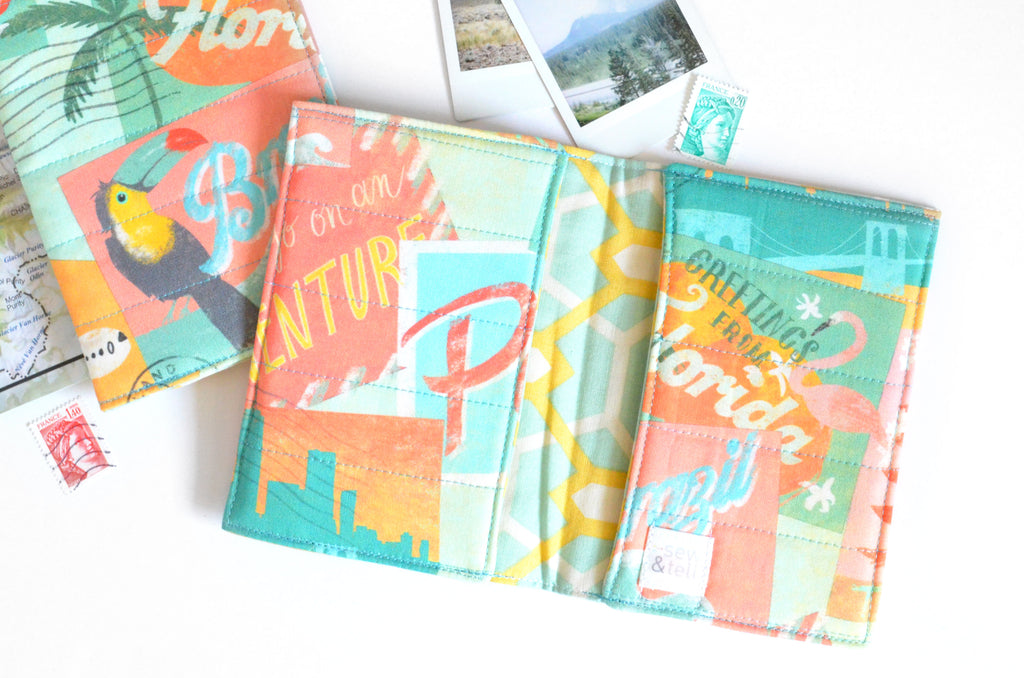โ This bright passport cover features aย fun travel-inspired postcardย fabric! Please note, exact fabric placement may vary from some of the photos shown.