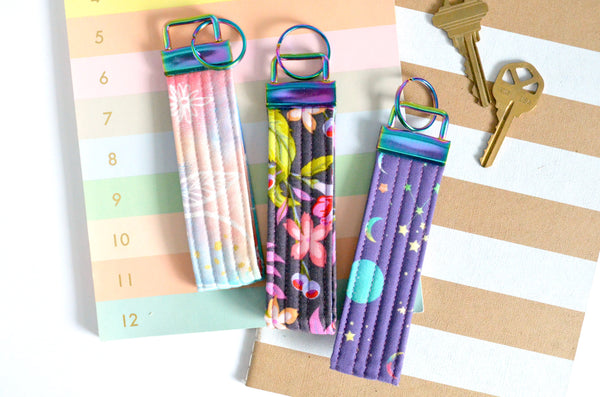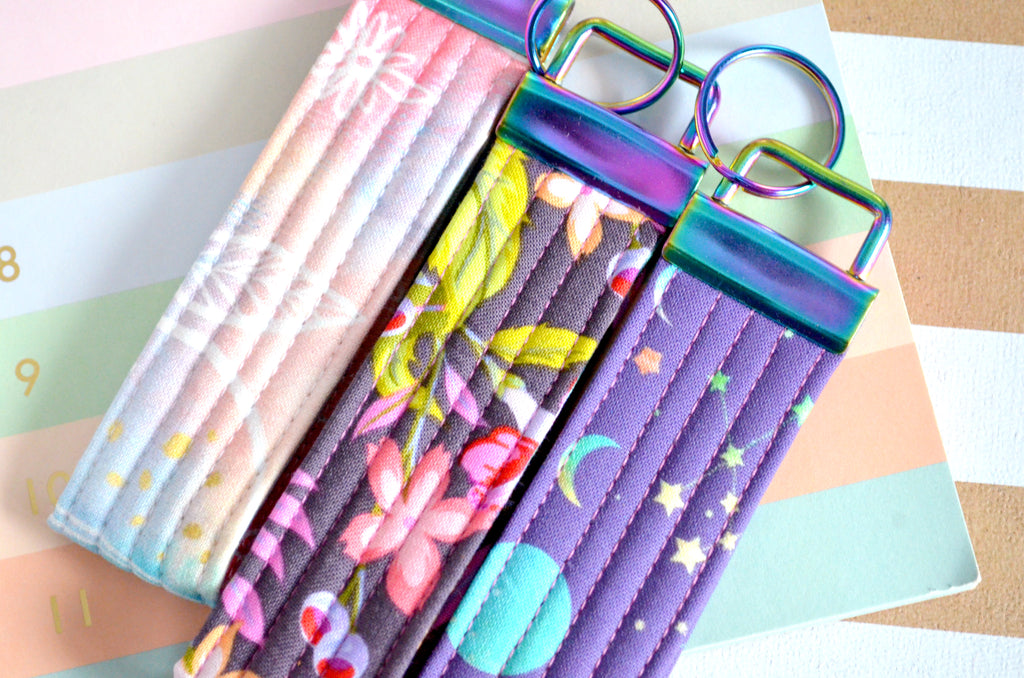 These fabric key fobs feature a beautiful mix of designer cotton fabrics, which are sure to make a stand-out appearance on your bag or your set of keys! Both the thickness and bright colours of these keychains make it a breeze to find your keys, whether digging through the bottom of your purse or looking for them around the house. Not only do these key fobs make the perfect gift to slip in alongside a few other goodies, they are also each 100% unique! Theirย quilted natureย means that no two key fobs are ever sewn together exactly the same, making each one truly a one-of-a-kind piece!