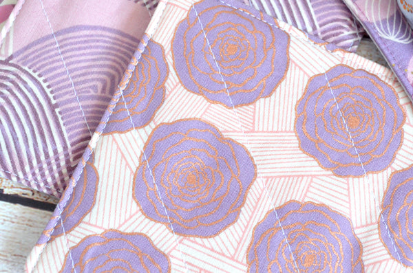 โข Coasters are reversible, with a coordinating fabric print on the back