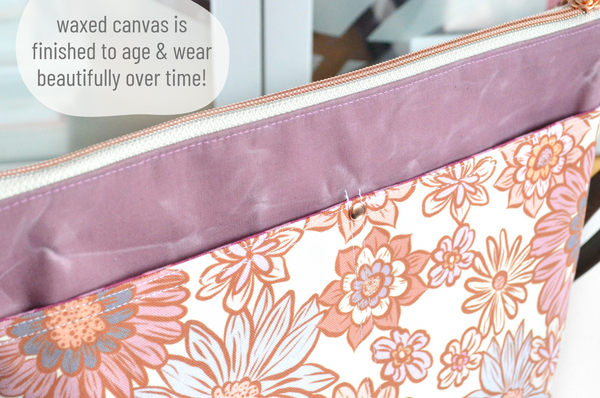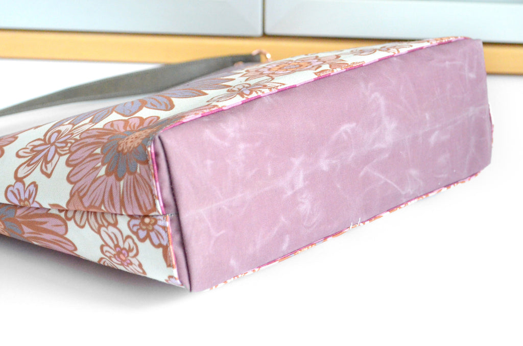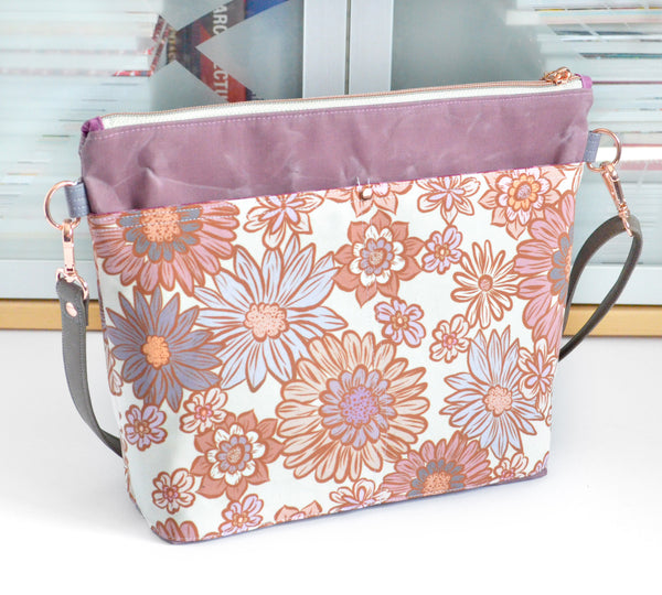โ This crossbody bag features a lovely light purpleย waxed-canvasย exterior, with a beautiful Golden June floral feature fabric!ย This bag includes a coordinating adjustable faux-leather crossbody strap.