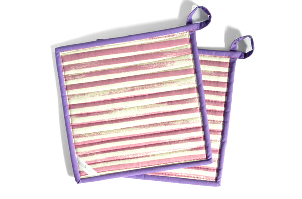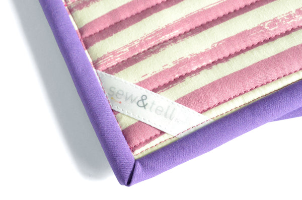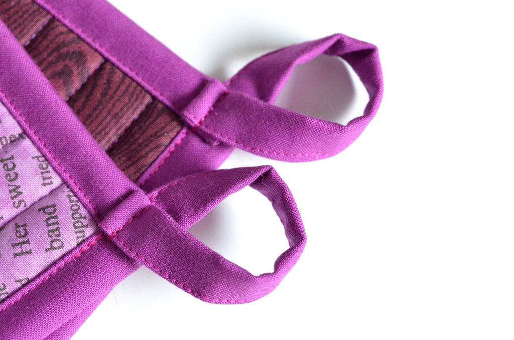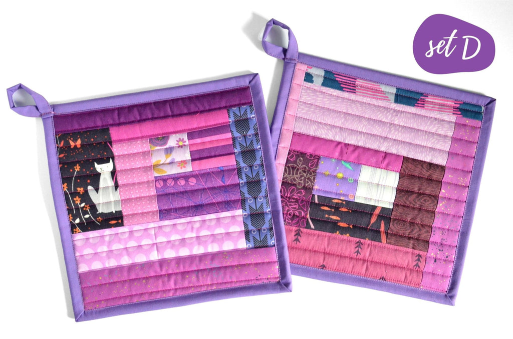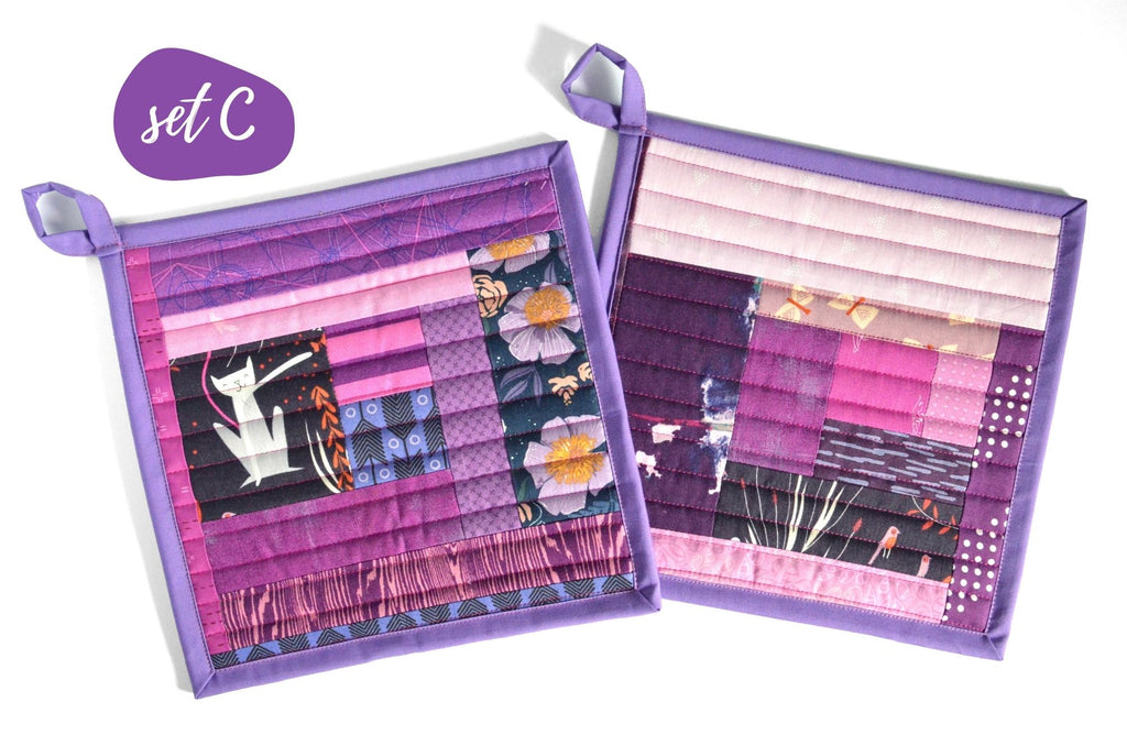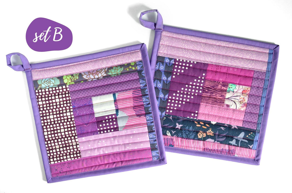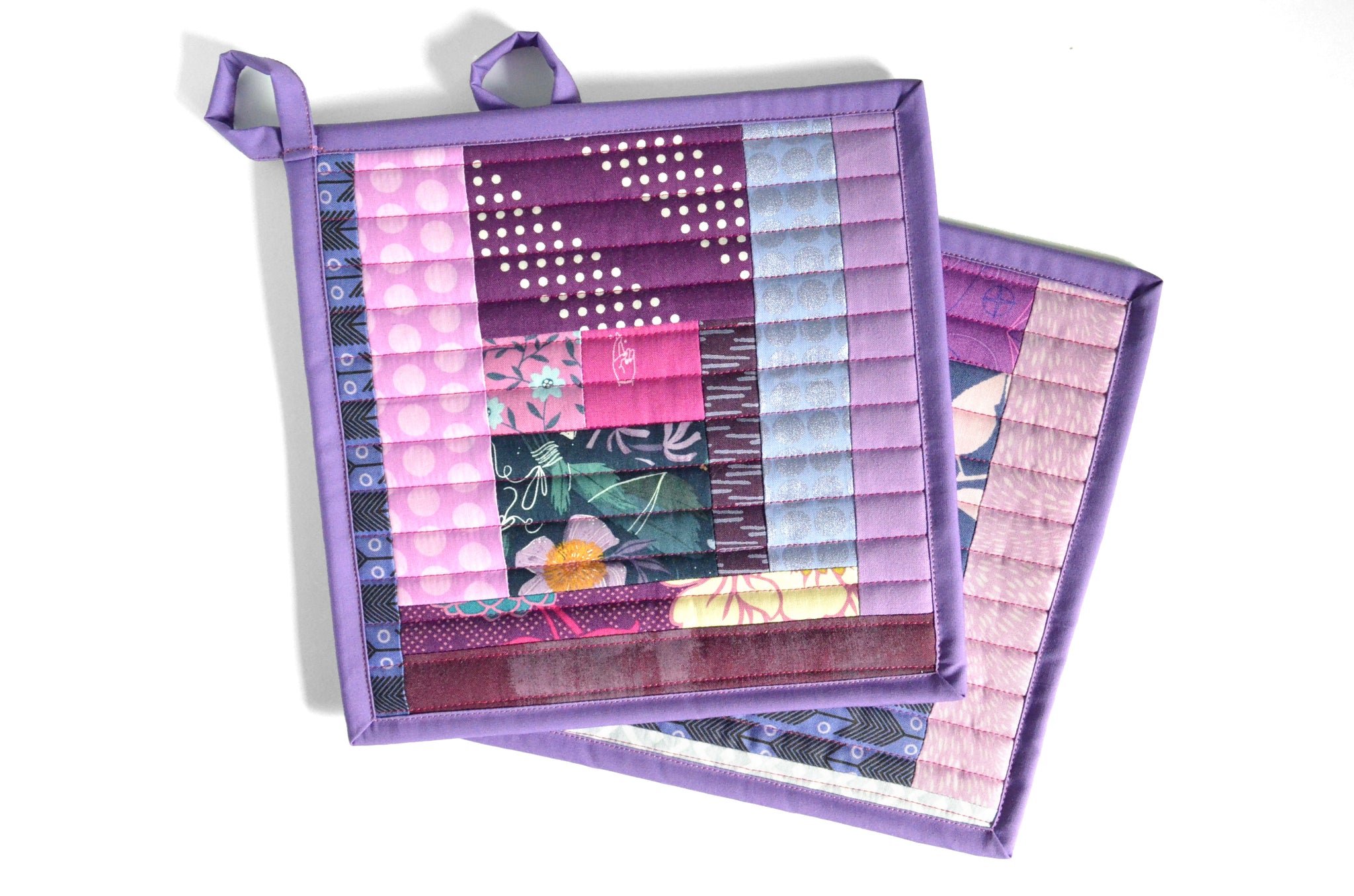 โ This purple potholder set features a beautiful mix of cotton fabrics, sewn and quilted into a modern take on the traditional โlog-cabinโ quilt block.