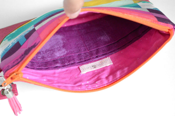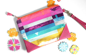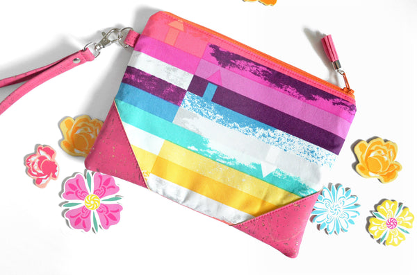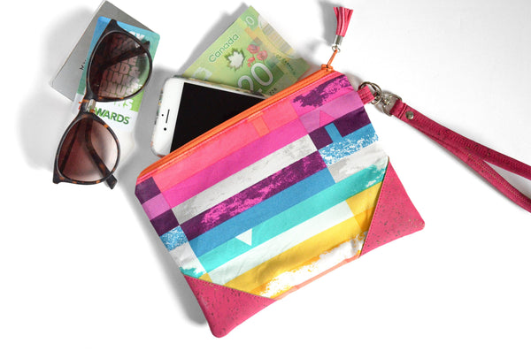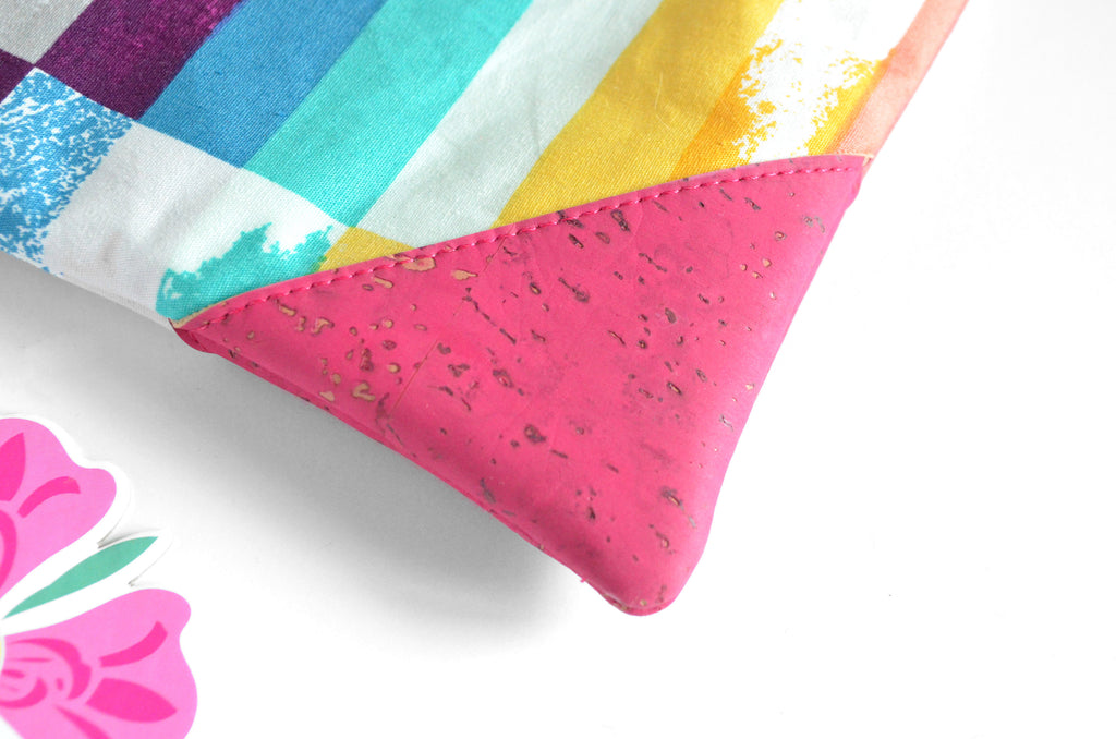 โ This rainbow wristlet clutch features a bright fabric designed by Katarina Roccella, accented by beautiful cork leather cornersย