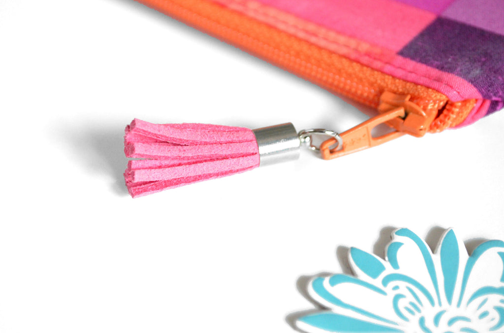 โข Zip closure, including a beautiful faux-suede tassel pull