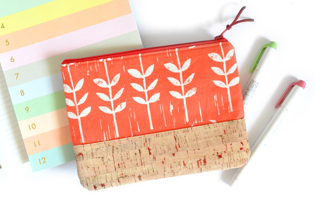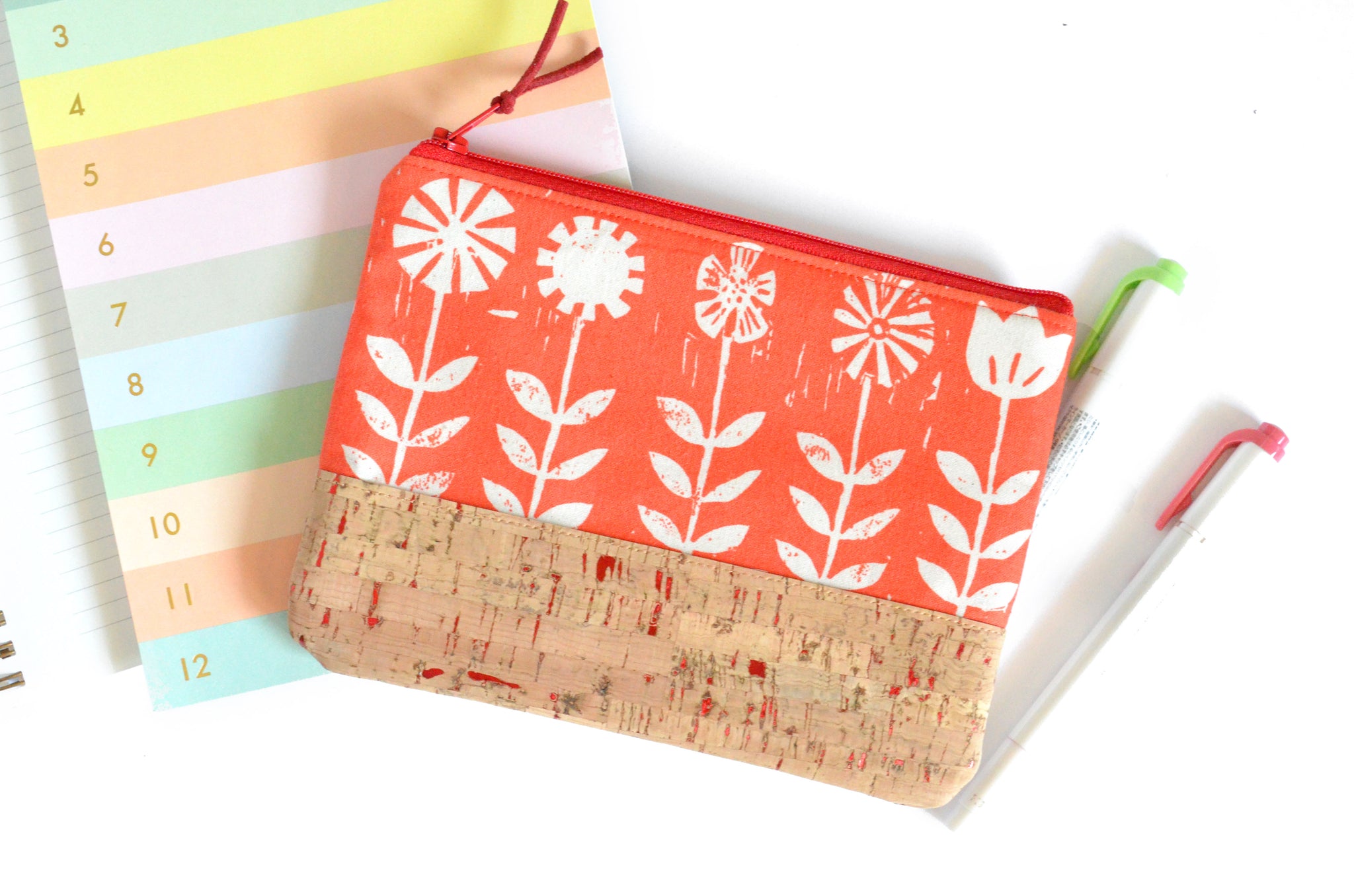 ★ This red pouch features a beautiful floral print fabric, and is accented with a cork leather bottom
