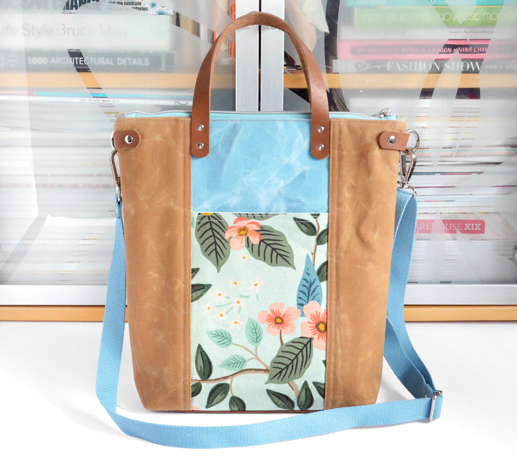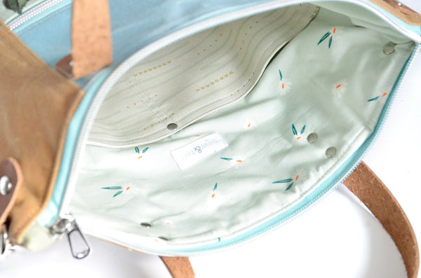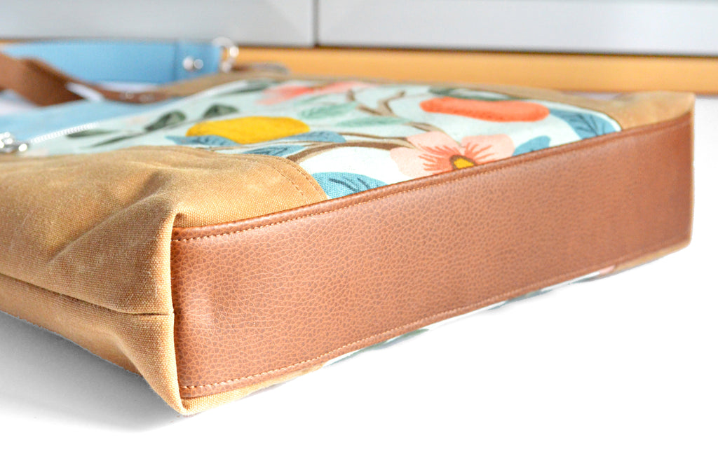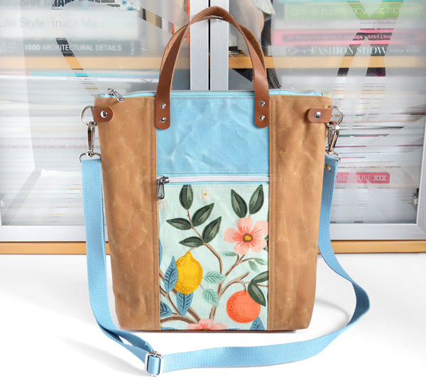 This tote bag features aย tan brown & light blueย waxed-canvasย exterior, with a beautifulย citrus floral canvas feature panel!ย This bag includes a coordinating adjustable crossbody strap.