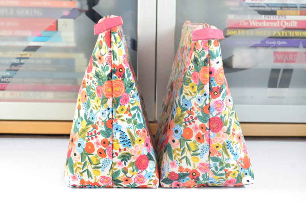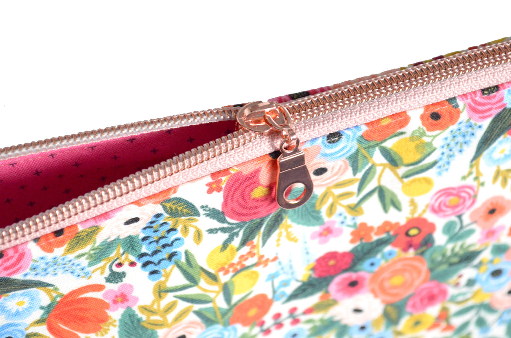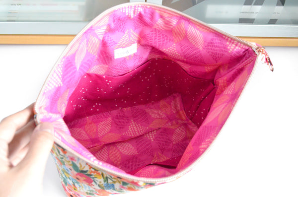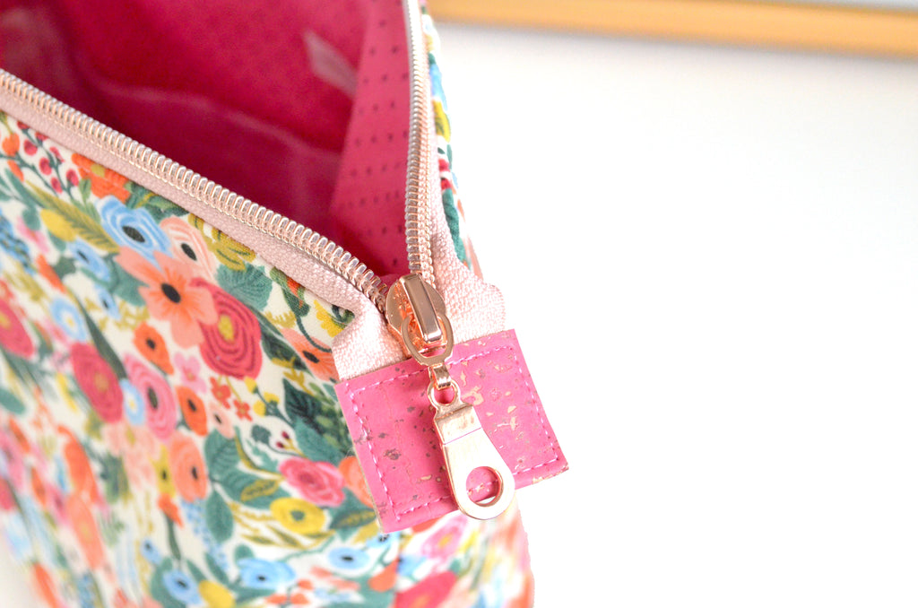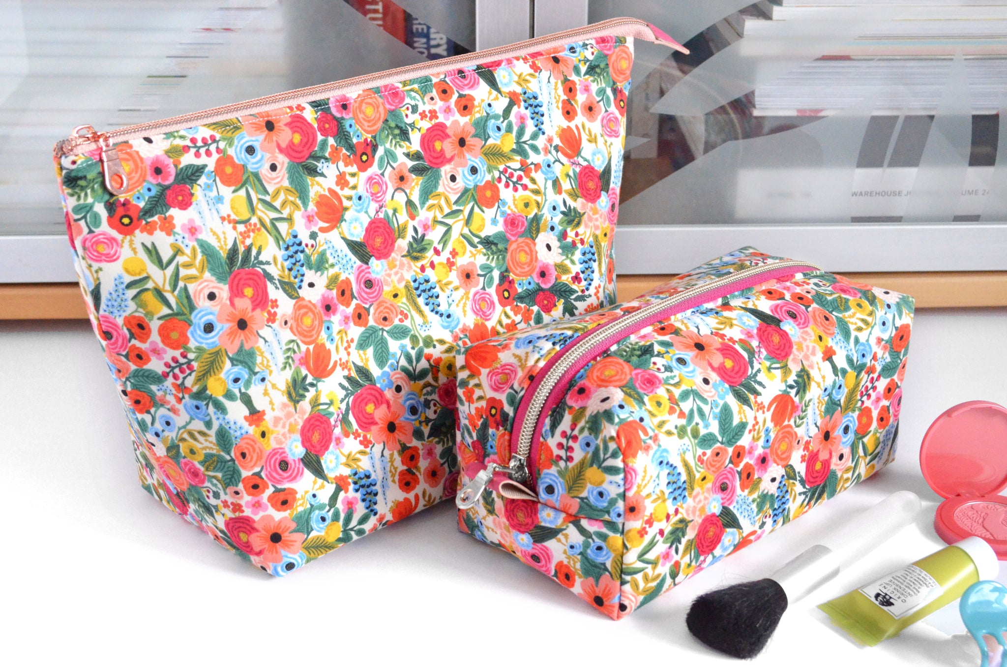 ย Theseย bright pink toiletryย bags are made with aย beautiful floral printย fabric, designed by Rifle Paper Co!
