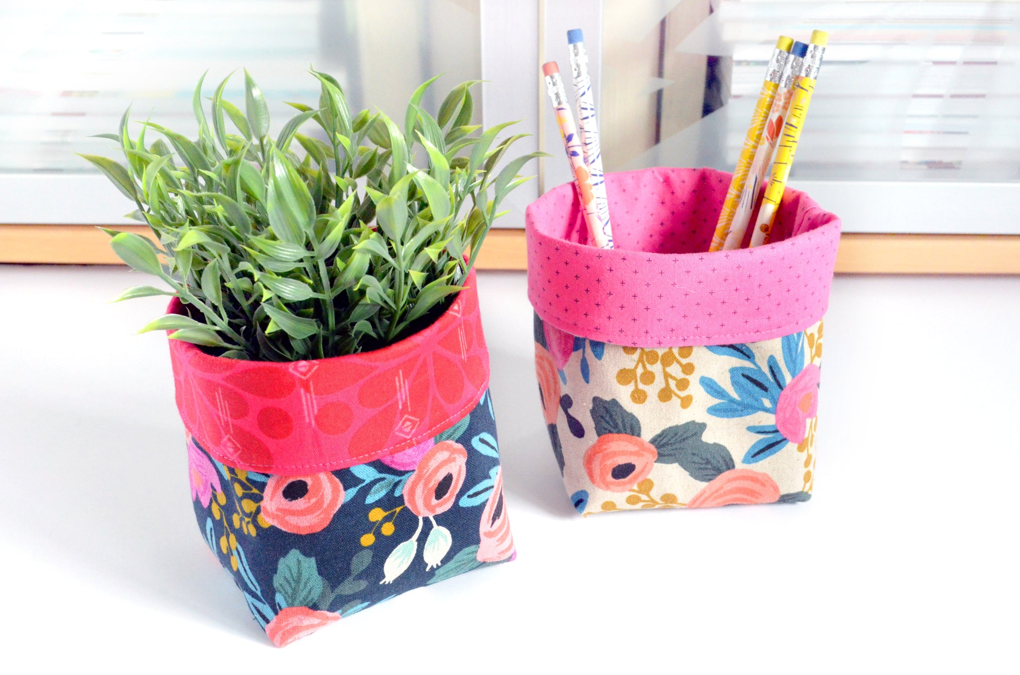These fun fabric plant pots are made from a variety of beautiful cotton-canvas prints, with bright coordinating lining fabrics which peek out the top! These fabric covers are the perfect solution to the ugly plastic pot your plant comes home in from the store, with no more need for messy re-potting. Just slip your existing plant pot into this bin, and voila! Theyโre even height-adjustable to perfectly suit different sizes of plants, or when adapting these bins for other specific needs. These little buckets also make the perfect container for holding pens and pencils on your desk, cosmetic brushes in the bathroom, essential oils on your nightstand, or any other odds and ends you need to keep organized. Their versatile uses make these a great gift for gardeners, co-workers, teachers, or yourself!