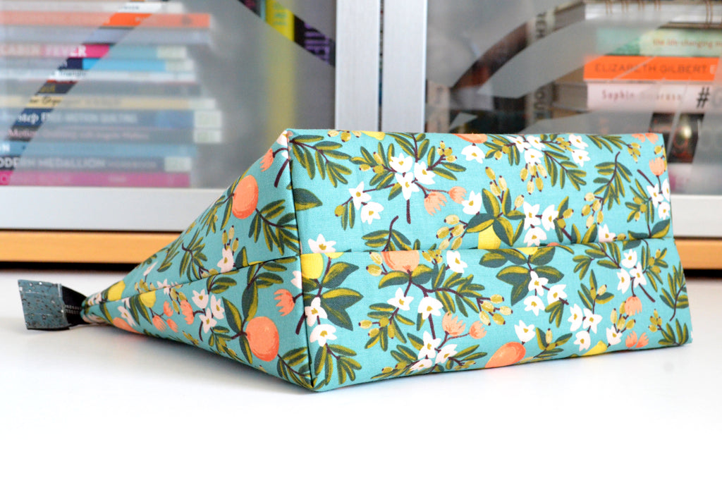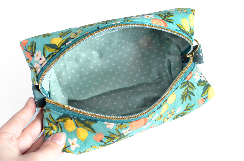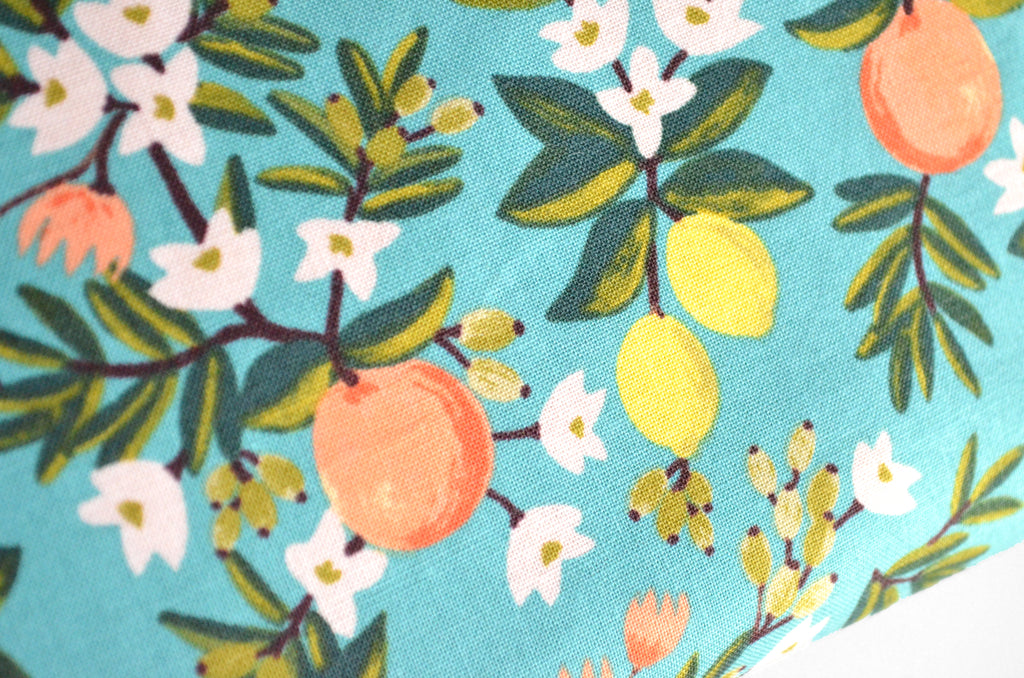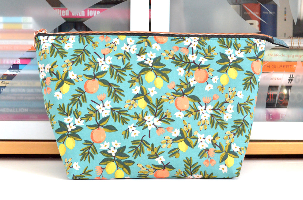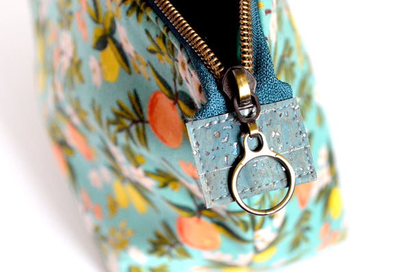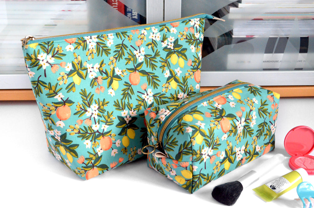 ย These teal blue toiletryย bagsย are made with aย gorgeousย citrus floralย fabric, designed by Rifle Paper Co!