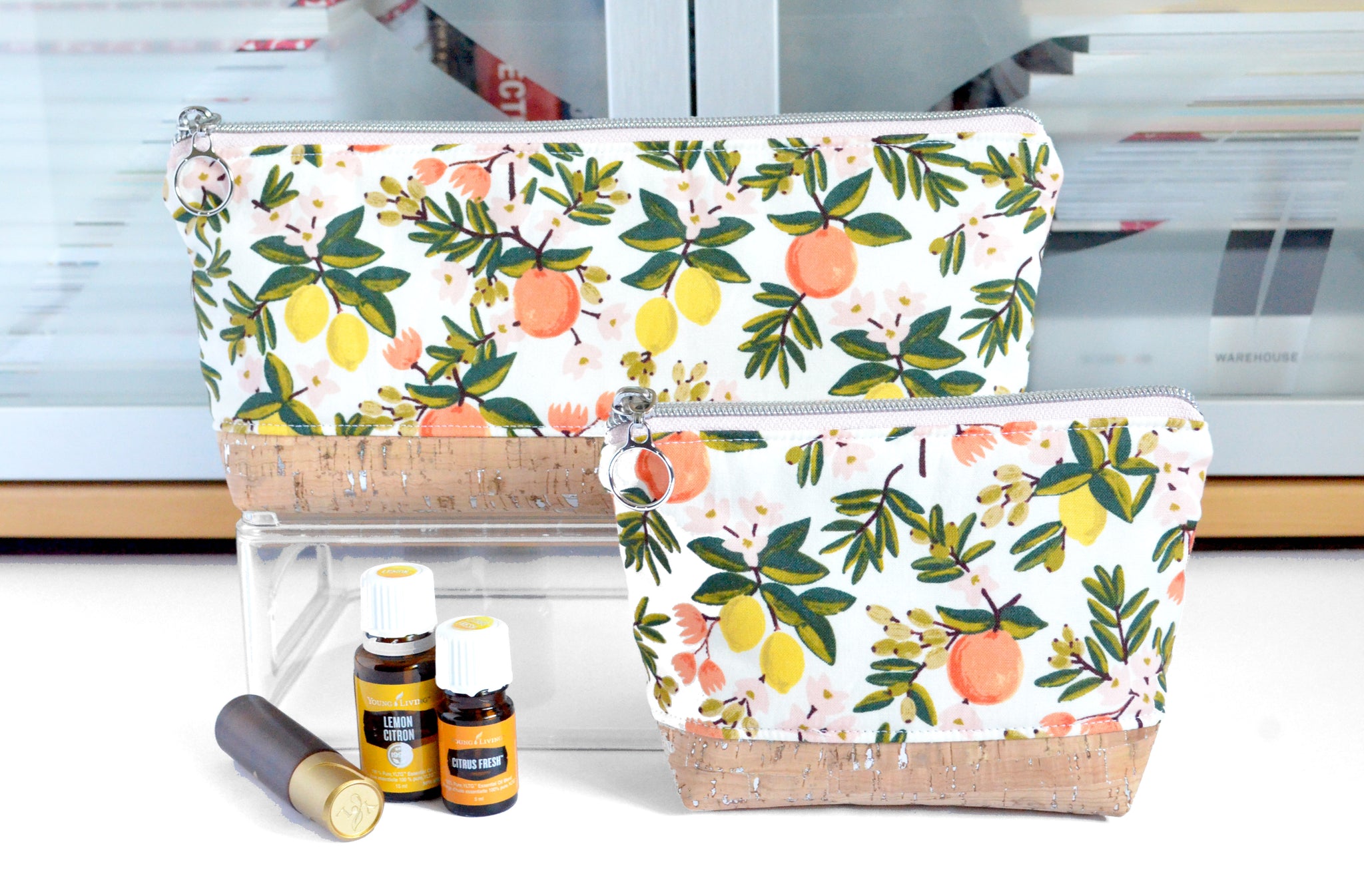 ★ These white essential oil bags feature a beautiful citrus fabric designed by Rifle Paper Co, accented by a metallic-fleck cork leather bottom!