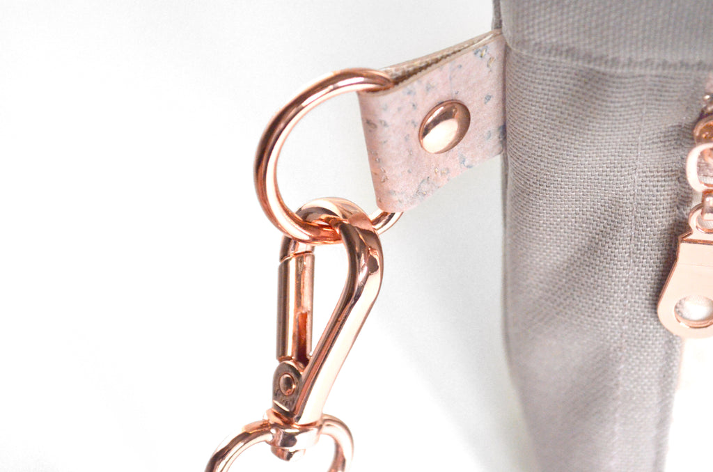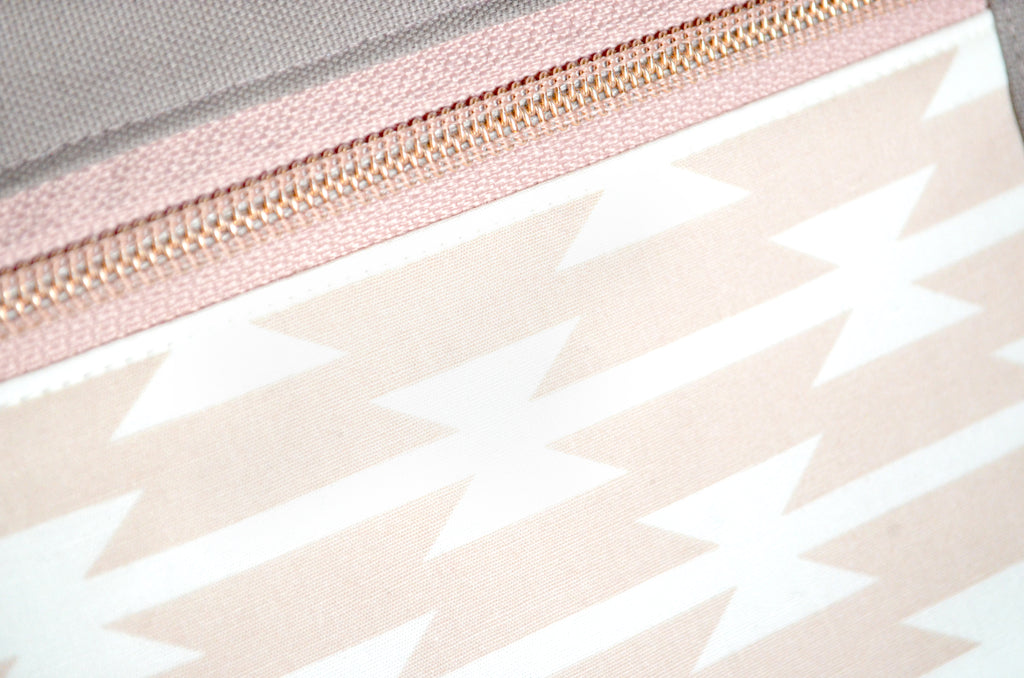 • Double zip closure (main compartment and front pocket), including beautiful faux-suede zipper pulls