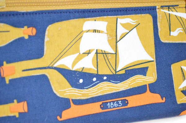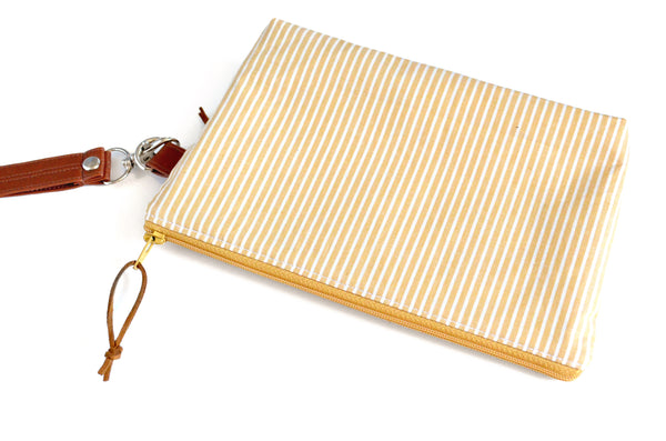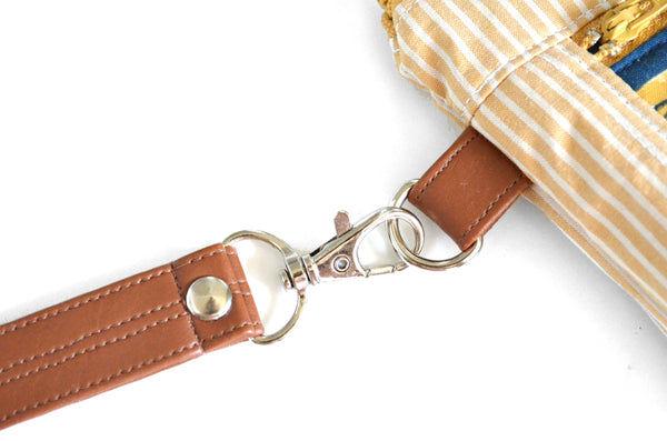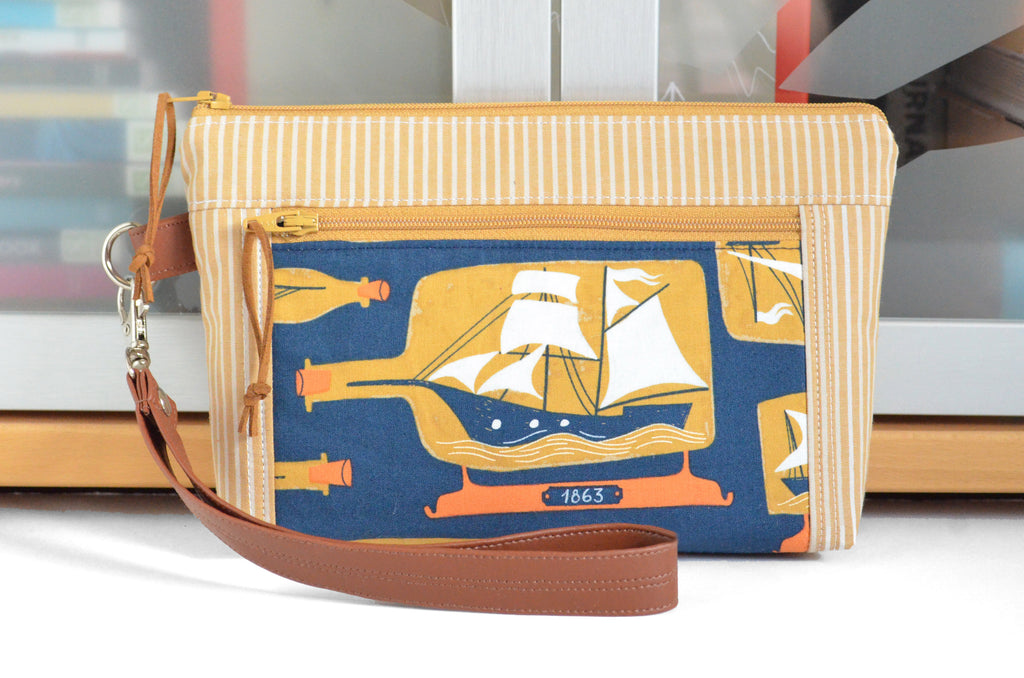 ★ This wristlet features a beautiful yellow striped cotton fabric, paired with a fun ship-in-a-bottle print from Dear Stella! Included is a coordinating faux-leather wrist strap.