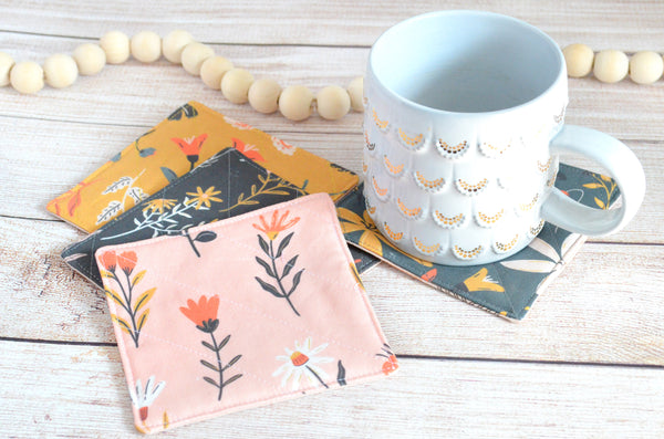 โ This set of four fabric coasters features a beautiful selection ofย floral print fabrics! Please note, exact fabric placement may vary from some of the photos shown.ย