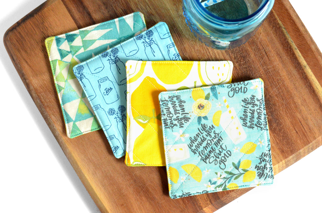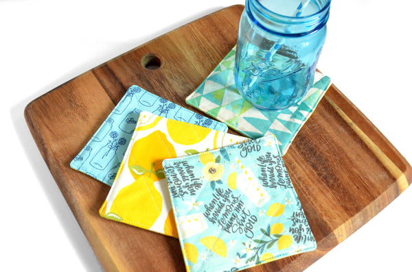Our quilted fabric coaster sets are sure to bring a pop of colour to your coffee table or dining room, while also providing you with practicality and versatility! Made with a layer of cotton quilt-batting inside, these coasters are great at soaking up unwanted condensation from your drink, and wonโt stick to your glass when you pick it up! Available in a wide-range of fun prints and colours, these coasters also make for the perfect unique housewarming or hostess gift!