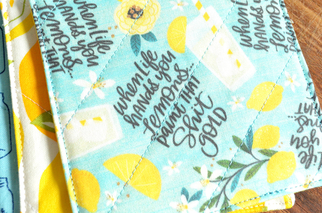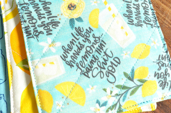 โ This set of four fabric coasters features a fun selection of fabrics withย "sweary" sayings designed by Canadian artist and illustrator Cynthia Frenette! Please note, exact fabric placement may vary from some of the photos shown.