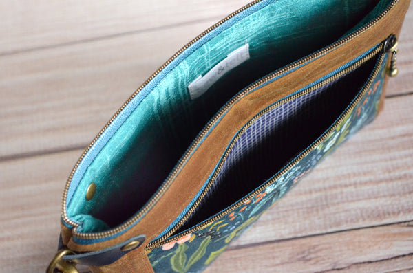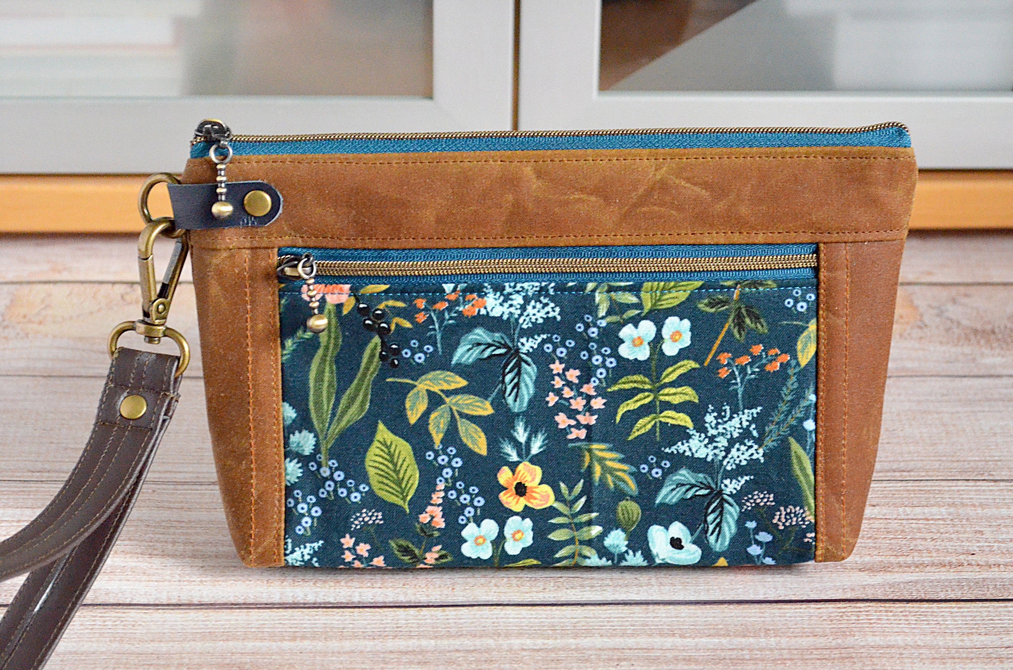 ★ This wristlet features a lovely caramel-brown waxed-canvas exterior, with a beautiful Rifle Paper Co floral feature panel! This bag includes a coordinating faux-leather wrist strap.