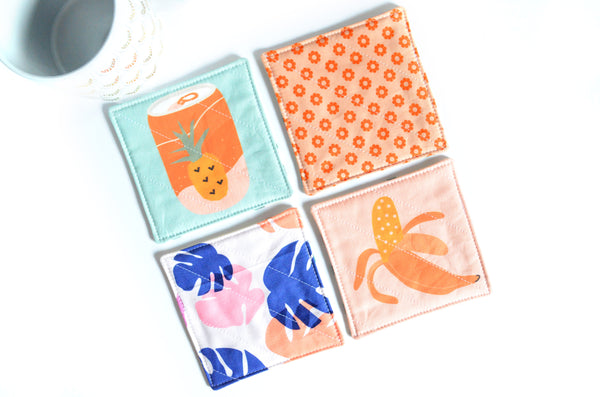 โ This set of four fabric coasters features a fun selection of summer print fabrics!ย Please note, exact fabric placement may vary from some of the photos shown.