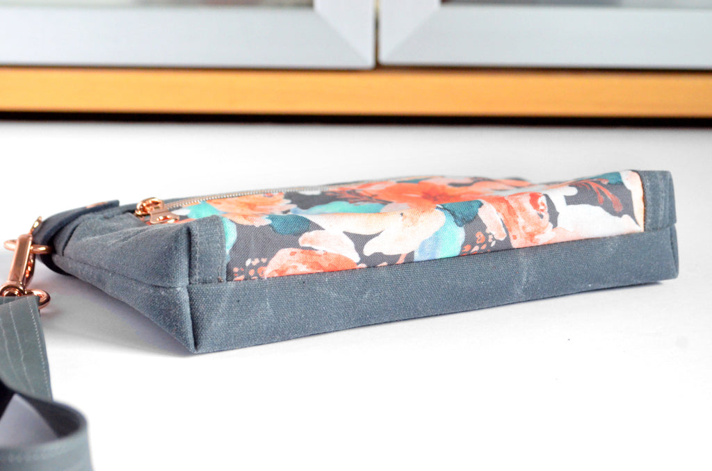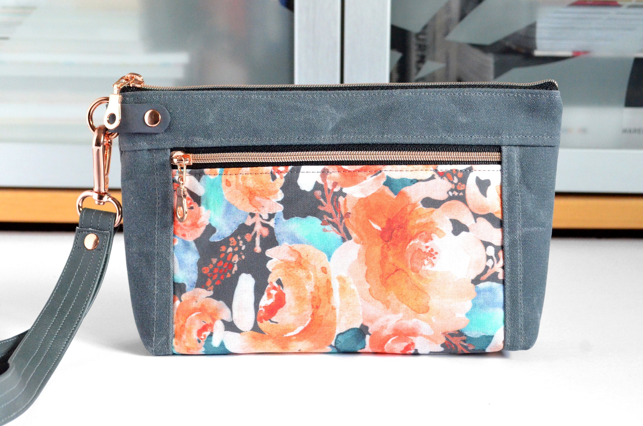 ★ This wristlet features a lovely waxed-canvas exterior, with a beautiful floral feature panel - the perfect pairing for Fall! This bag includes a coordinating faux-leather wrist strap.