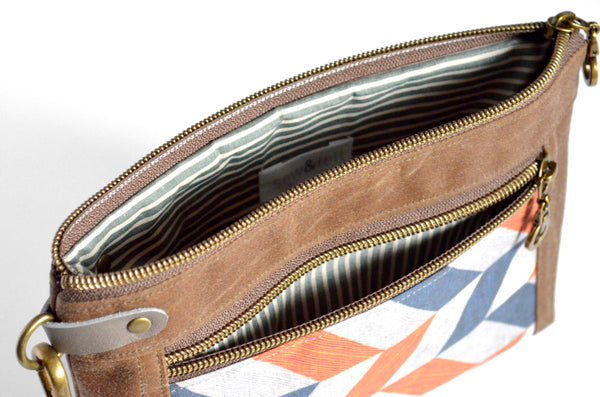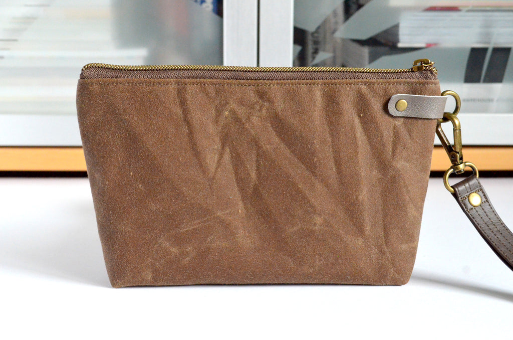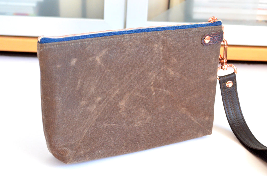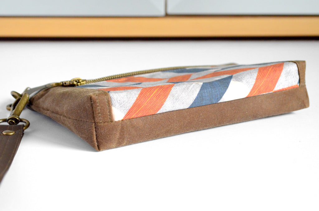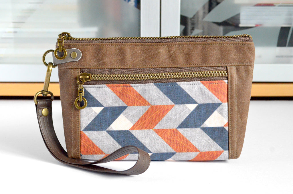 ★ This wristlet features a lovely waxed-canvas exterior, with a beautiful chevron print feature panel! This bag includes a coordinating faux-leather wrist strap.