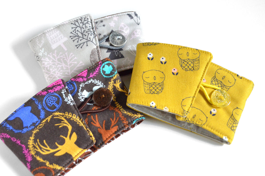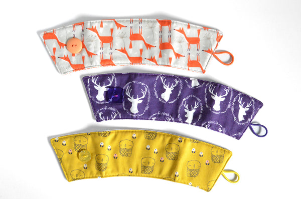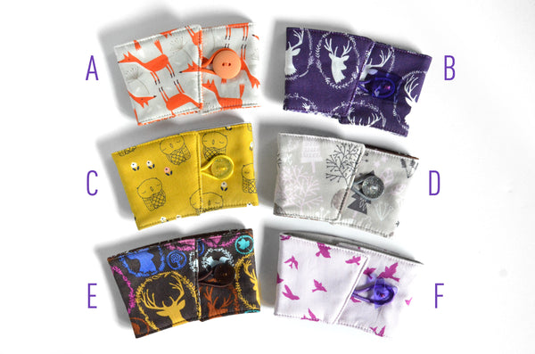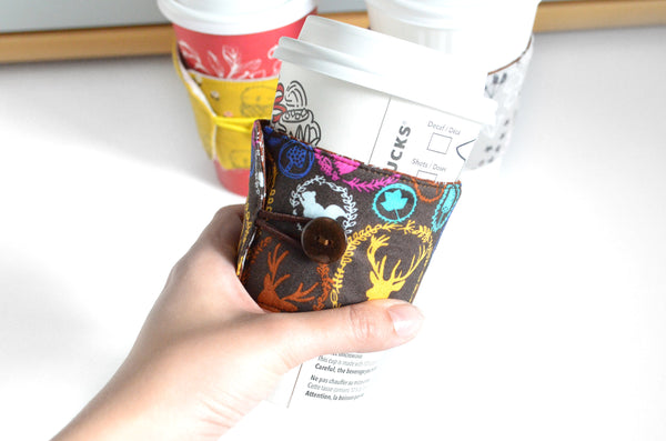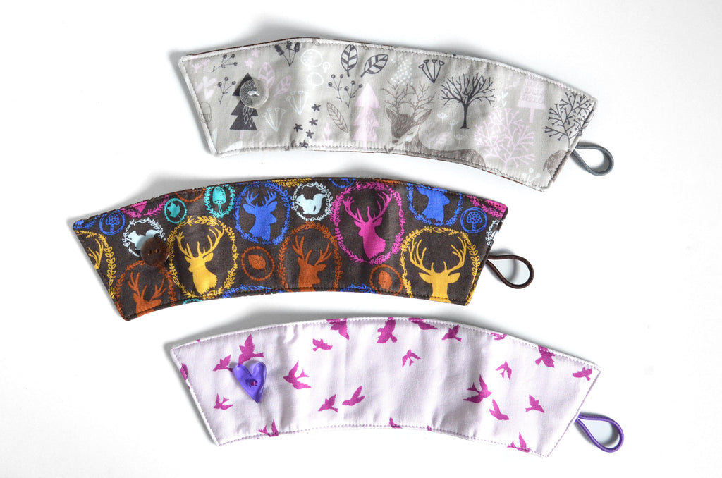 โ These woodland-themed coffee sleeves are made with beautiful cotton fabrics, featuring fun coordinating buttons!ย